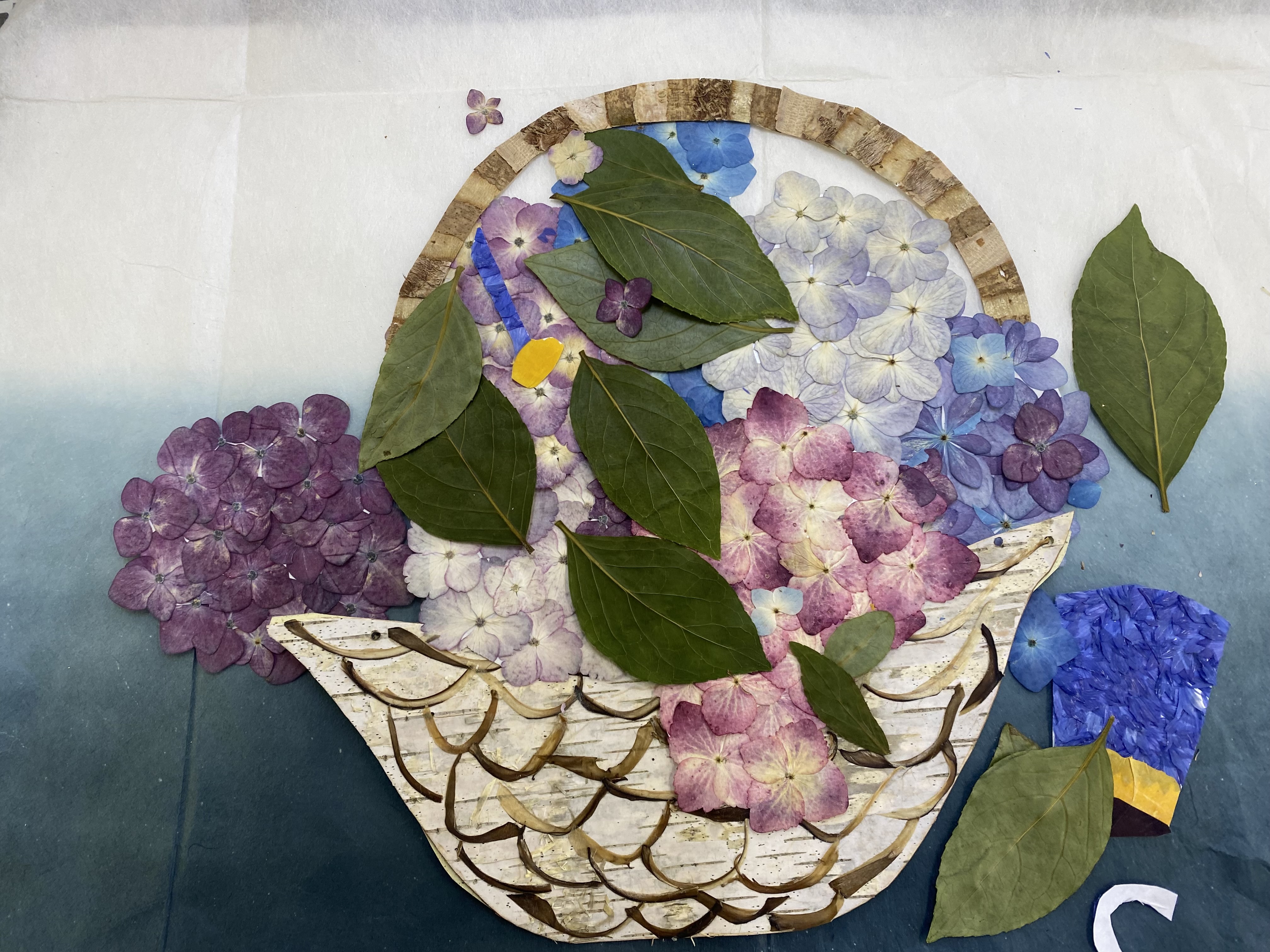 1月31日金曜日。1月も最後の日を迎えた。今日は今年初めての押し花のお稽古日だった。本来なら第3金曜日なのだが先生の都合で本日になった。今日は遂にアジサイの花籠を完成させ、額に密封して絵額にした。思えばまだアジサイが美しく咲き誇っている初夏に花を採って押し花にし、その後、花籠をつくり持ち手を作りジョーロを追加するなど細かなことを細々と続けてやっと今日で完成した。7か月ほど要していることになる。月イチのお稽古だし、自分が予習復習などというものを全くせずお稽古日当日だけ参加するという状態だから日数をかけてはいるが実質は7回位のレッスンで完成しているということだ。49額と作品展用の大きさなのでまあ、これくらいは仕方ないか。 押し花作品を和紙の上に置いてみる 上部が真っ白で寂しいのでパステルで色を加える 密封する 額装して完成満足いく作品とは程遠いが、自分が真剣に取り組んでこなかったのだから止むをえない。