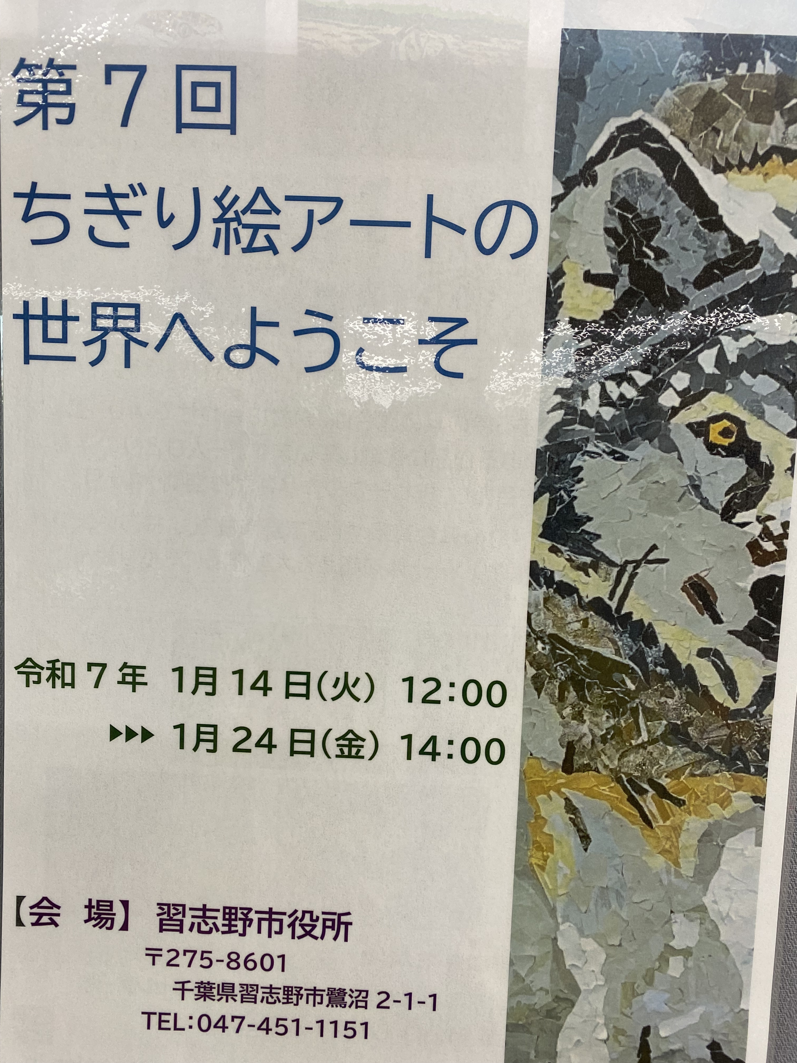 1月20日月曜日。今日から大寒に入ったのにいつもより暖かい。冷え込まず生ぬるい空気感で朝も楽だった。退勤後、市役所に事務処理に立ち寄ったら「第7回ちぎり絵アートの世界へようこそ」という小さな展覧会場があった。解説によると市内にある社会福祉法人 習愛会 花の実園 生活介護アートグループ共同制作のちぎり絵ということだ。かなり大型の作品が10点以上展示されていた。色使いの濃淡を表現する絵具の調合は題材に合わせて40色以上の色を駆使し、趣のある作品に挑戦していて、一つの作品試作期間は1か月という。近くで見るより少し離れてみると全体が把握できて作品の力強さが感じられた。 流行りのゴジラや干支にちなんだ蛇など様々な題材の作品はどれも大胆で面白く、力作揃いだった。「花の実園さくらまつり」の舞台背景や「習志野福祉ふれあいまつり」の会場装飾など、巾10mを越える大型作品にも取り組んでいるという。素晴らしい。花の実園の皆さんの意欲と根気強さに感心すると同時に、機会があれば花の実園を訪ねてみたいと思った。