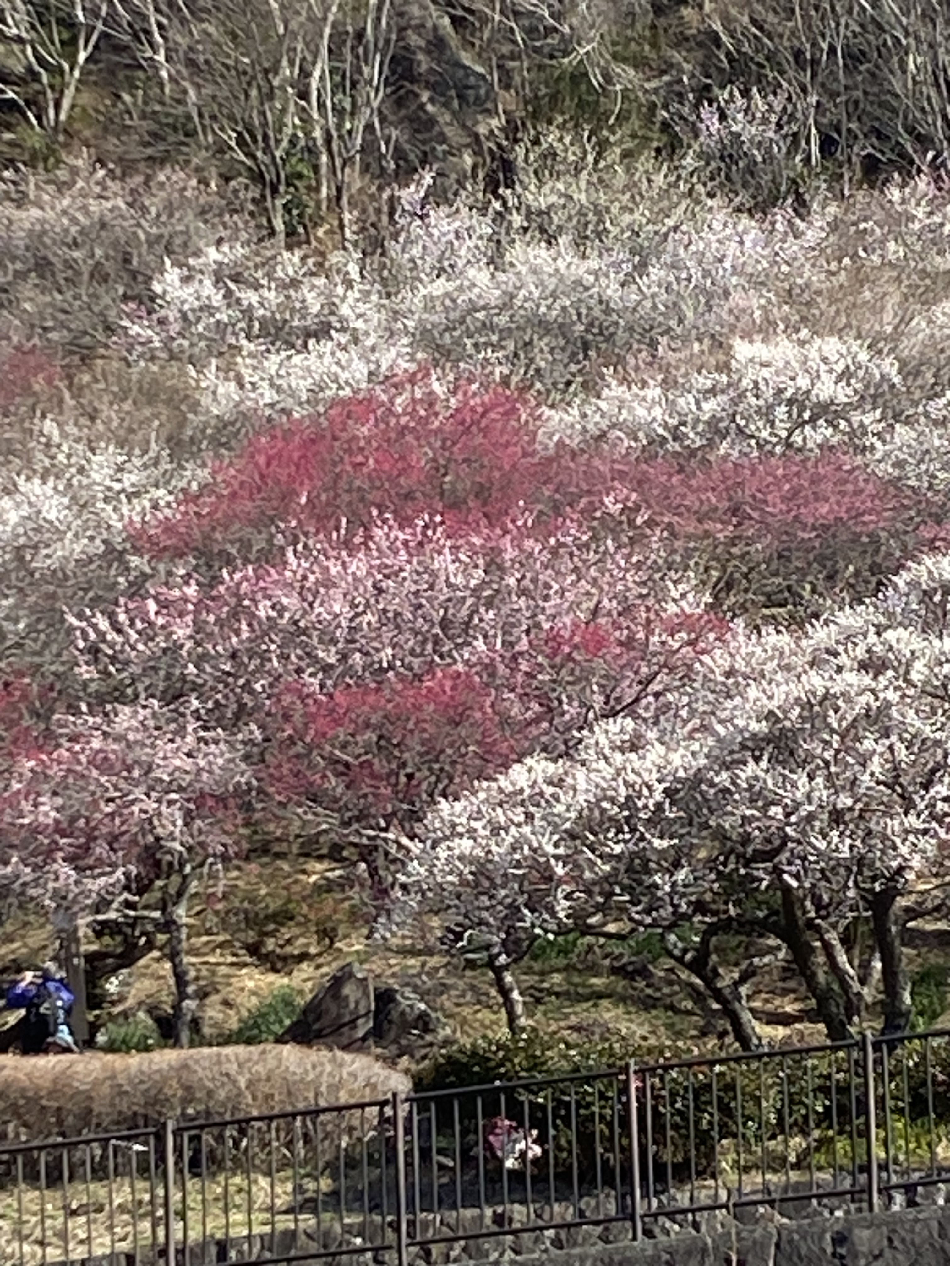 3月10日月曜日。前日まで雨や雪で不安定だったけどこの日は朝から太陽の陽射しが注いて青空がのぞくとても良い天気に恵まれた。私にもたまにはラッキーな日があり、予定通り湯河原幕岩にクライミングに出かけた。超人気のこのエリアは丁度梅まつりが前日に終了したこともあって、比較的落ち着いていた。でも梅の花は満開で全山紅梅・白梅・黄梅などが咲き誇り素晴らしく、観梅に来ただけでも価値があると感じた。ここには何度も来ているがここまで梅の花が満開で盛大に咲き誇っているのはほぼ初めてだった。でもクライミングは昨年12月以来なので初心者マークだった。他の参加者はクライミングに特化しているお上手な方ばかりで気がひけた。でも座右の銘 人と比べない 過去の自分と比べない 今を生きる を心に刻んで、他の皆さんとは別メニューで練習した。でも一日で7本昇れたので体が岩を思い出してくれ、最後は結構岩に馴染んだことを実感した。焦らず自分のペースで昇っていくしかない。 満開の湯河原梅林 桃源郷の基本ルートを昇る私 正面壁のNガイド 頑張って昇るIさん