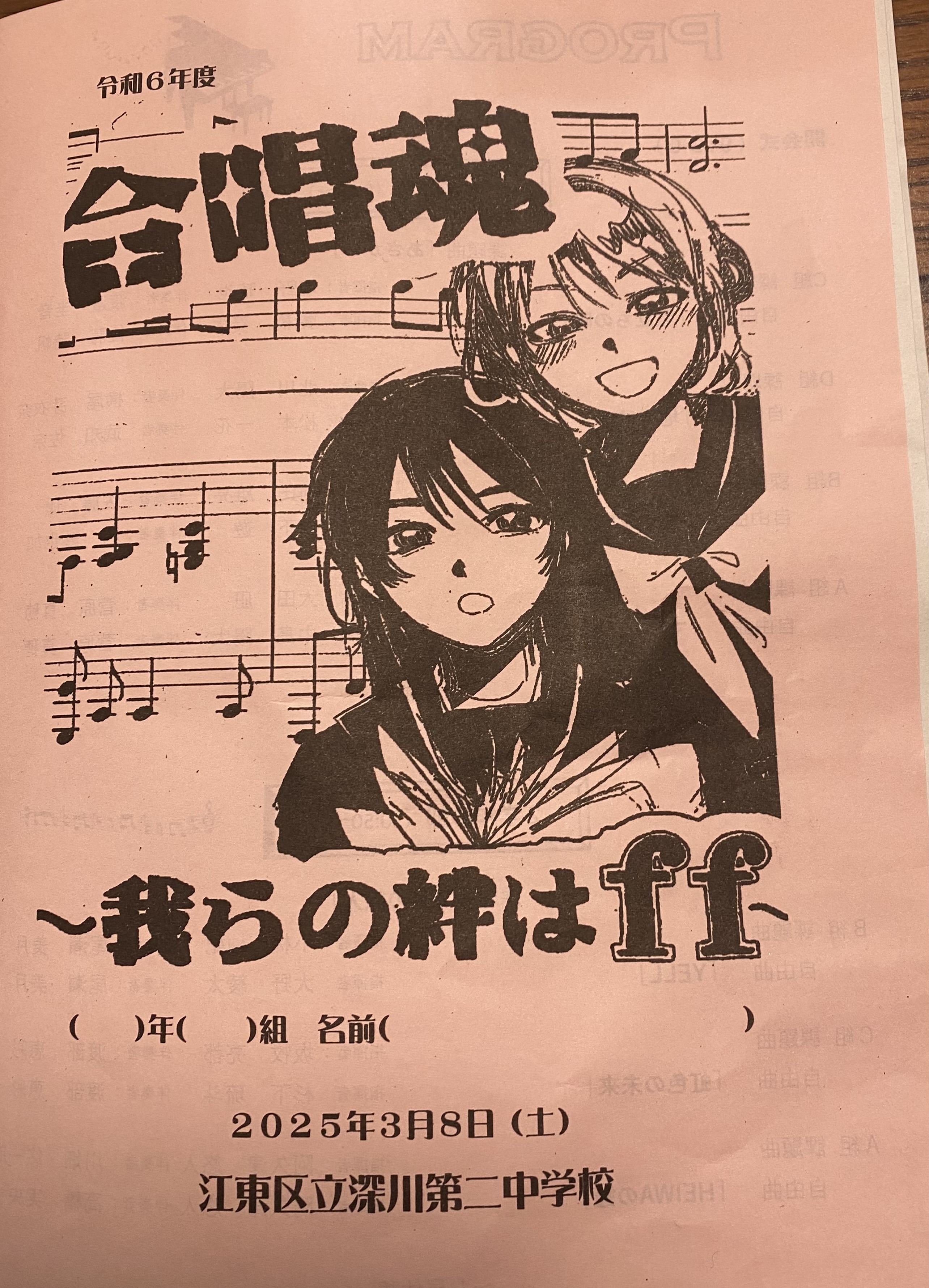 3月8日土曜日。中学生の孫・葵ちゃんの合唱コンクールと吹奏楽演奏会、小学生の孫・結ちゃんの吹奏楽定期演奏会が同日の同時間帯に行われた。そのため、私と娘は葵ちゃんの中学校へ、娘婿と翔君は小学校へと二手に分かれて発表会を聴きにいった。葵ちゃんの中学校では午前中、合唱コンクールがあり、午後に吹奏楽演奏会など文化系発表が行われた。合唱コンクールは1年生4クラスで課題曲「あさがお」とそれぞれの自由曲で競われた。どの学級もすごく演奏態度が立派で合唱も一生懸命歌っていて素晴らしかった。葵ちゃんの学級の自由曲は「マイバラード」で私も在職中に何度も教えた曲でとても懐かしかった。 全体プログラム 各学年自由曲 葵ちゃんの学級発表休憩をはさんで午後2時半から吹奏楽の演奏が発表され、葵ちゃんはトランペットを吹いて大活躍していた。コンクールで演奏した曲以外にミッキーマウスメドレーなど楽しい曲もあって被り物をかぶったり手拍子をしたりして、中学生の熱気が渦巻き、全校生徒と保護者が会場一体となって盛り上がり、素晴らしく楽しい時間になった。 吹奏楽の演奏 熱気あふれるパフォーマンス葵ちゃんの学校で中学生のエネルギーをもらってから娘宅に歩いて帰り、今度は結ちゃんの吹奏楽定期演奏会のプログラムを見せてもらった。同時間帯だったので聴けなかったのが残念だったけど、結ちゃんもトロンボーンを演奏して頑張っていたと娘婿から聞いた。 結ちゃんのプログラム トロンボーンの中央が結ちゃんまだ小さいと思っていた孫たちがぐんぐん成長して音楽関係の活動を盛んにするようになり、娘も私もとても嬉しい。無理強いしたわけではないので吹奏楽部に入って頑張っているのが奇跡のようにすら思える。この幸せが続くようにできる応援は何でもしたい。