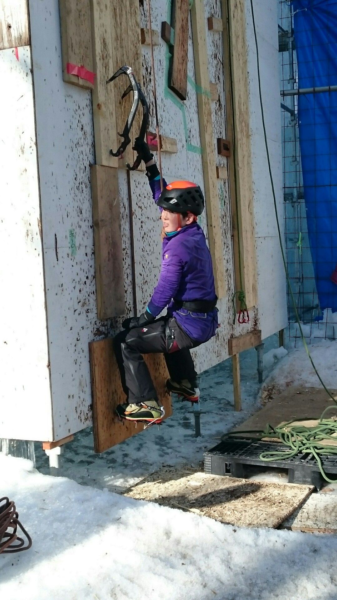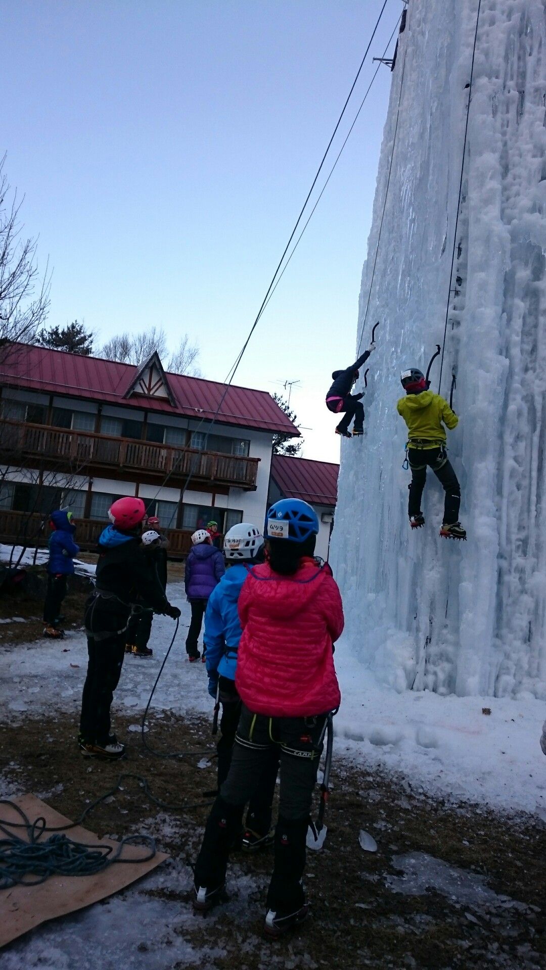 参加者は20名、講師陣は4名という体制でスタート。しかし肝心の岩根アイスツリーは暖冬でしっかり氷結してなくて、スケスケで反対側が見える状態だった。