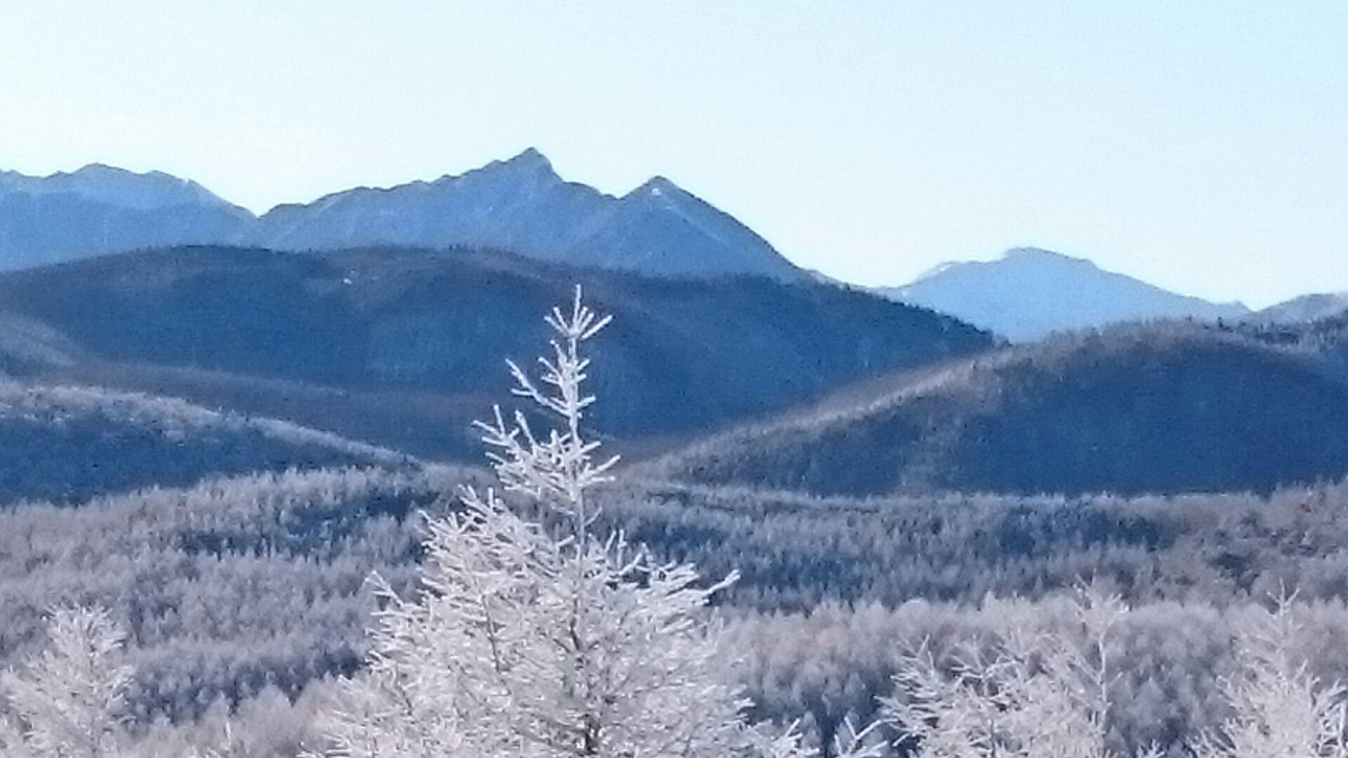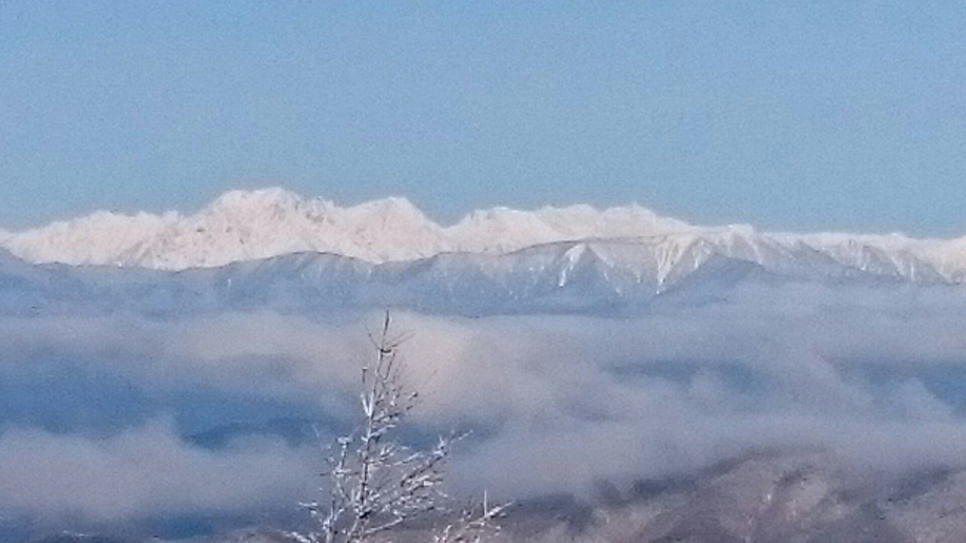 1月19日6時起床7時朝食。その後せっかくだから入笠山にハイキングに行こうという話になり、希望者だけが出発した。マナスル山荘のすぐ前からトレースがついているので気楽に取り付けた。静かな樹林帯を登っていき、トレースがはっきりしているので迷うことはない。しかしいくつかルートがあって単独でスタートした私は一般ルートではないルートを登ってしまったが、最後に皆さんと合流した。霧氷がとても美しい樹林帯を30分ほど登ると平らな山頂に出た。360度の大展望が開けていてみんなで歓声を上げた。