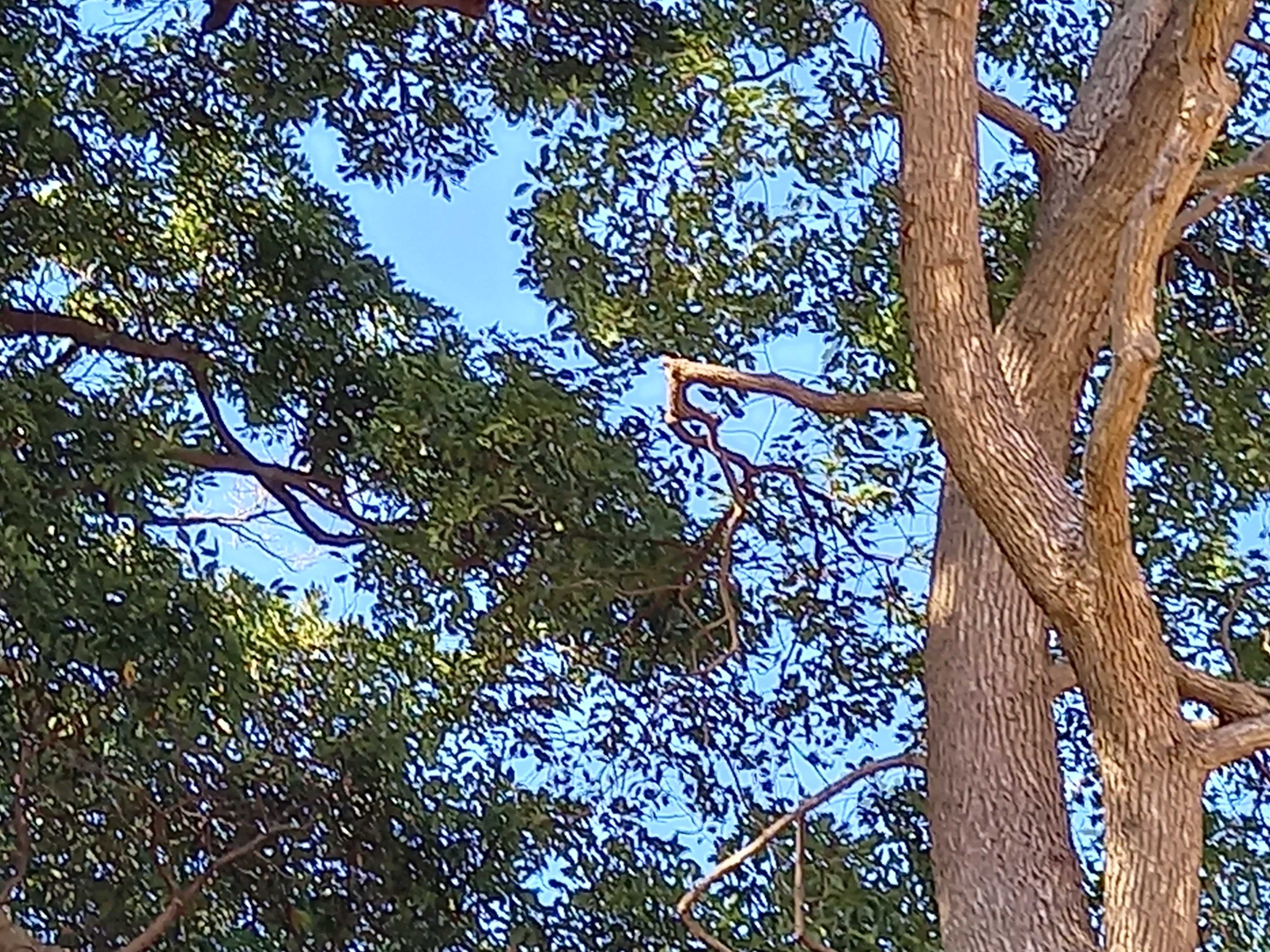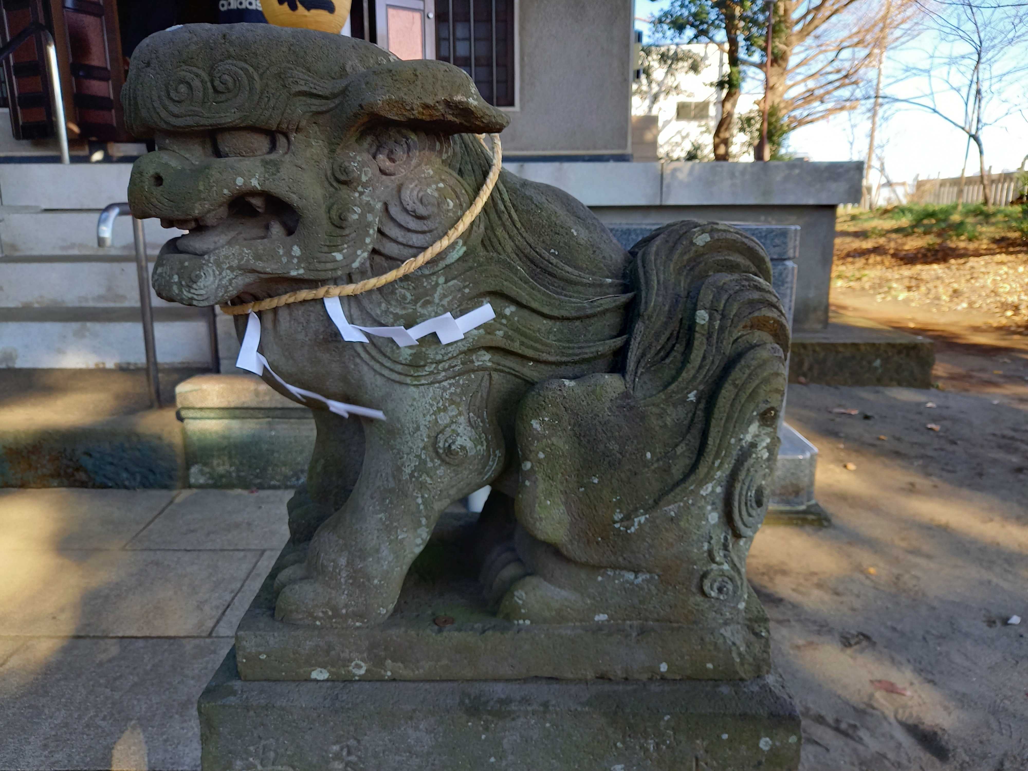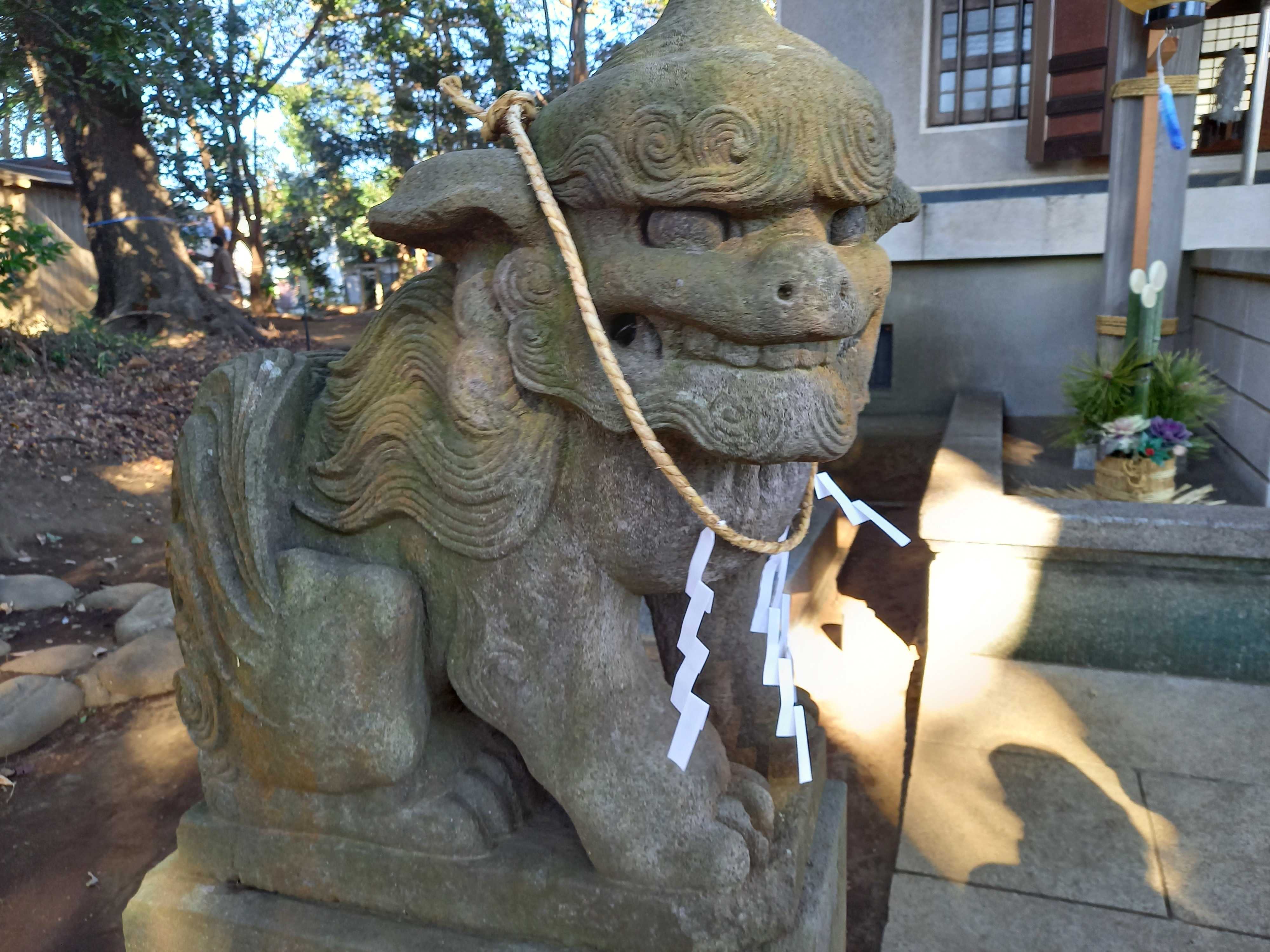 1対の狛犬​​ ​​           ​青空に巨木の葉が輝く境内