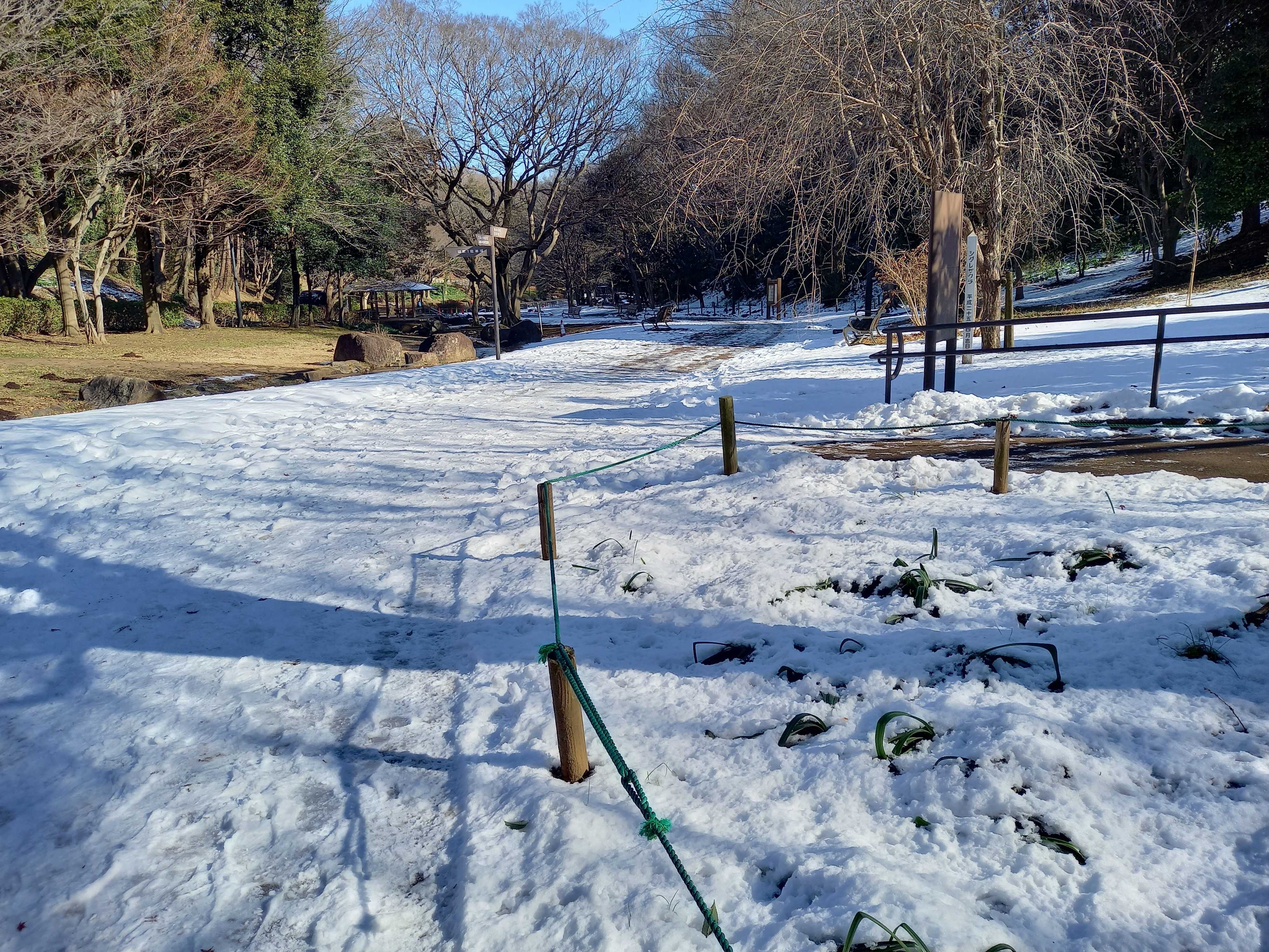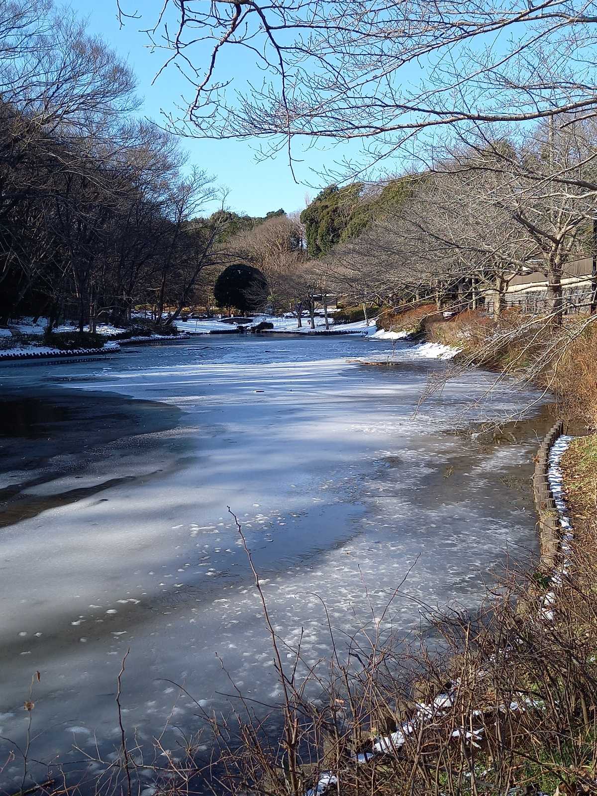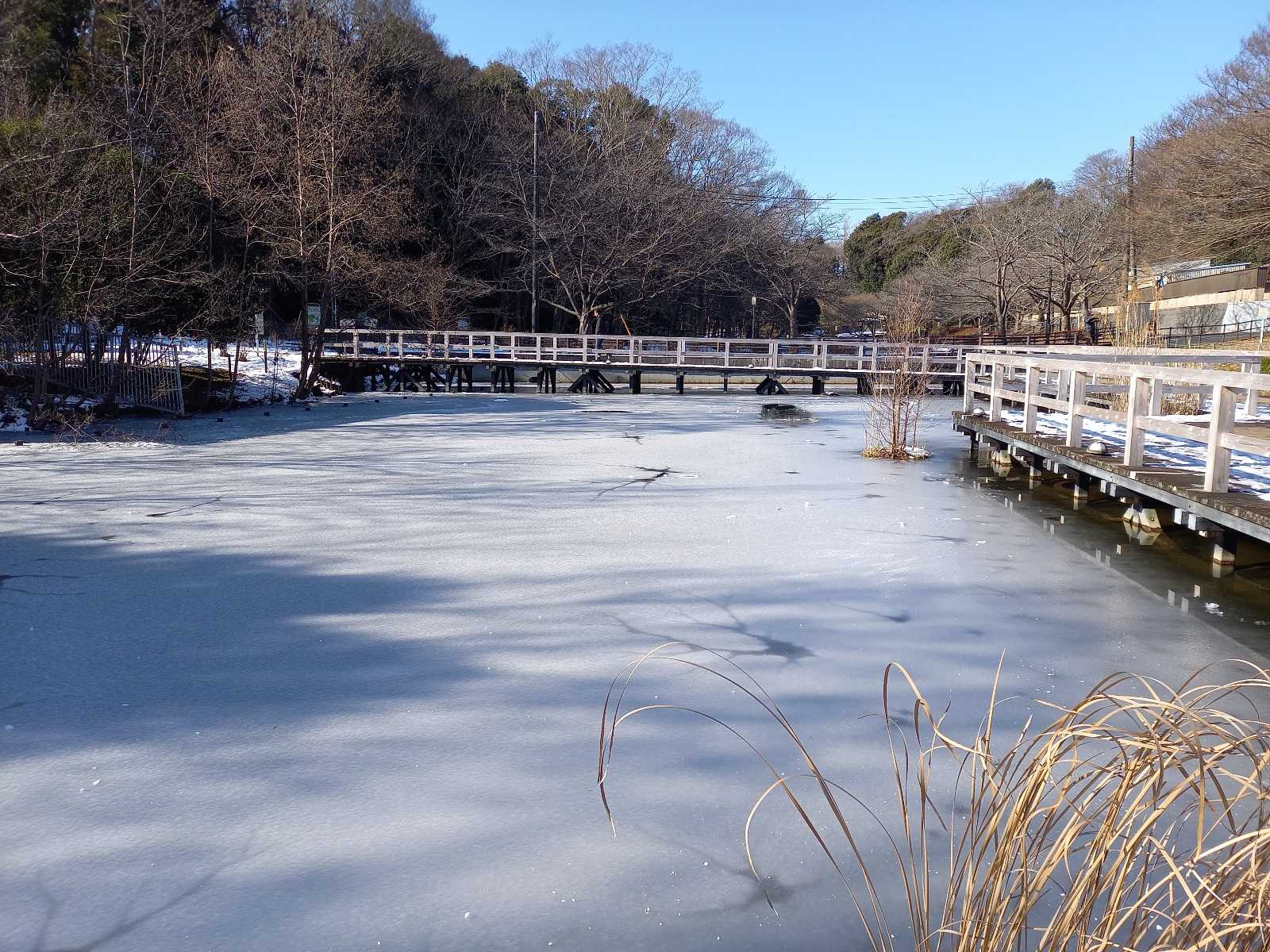 ここで思いもよらず雪景色を見ることができた。この公園は何十回も訪ねているが雪景色は初めてで驚いた。広場から渓流に下っていくと川は凍ってないが両サイドは雪がしっかり残って真っ白である。更に下って池まで行ったら何と池の水が凍っている。勿論鳥の姿はない。ここは千葉市の平地なのに池が凍っているなんて予想もしなかった。よほど降ったのだろうな。