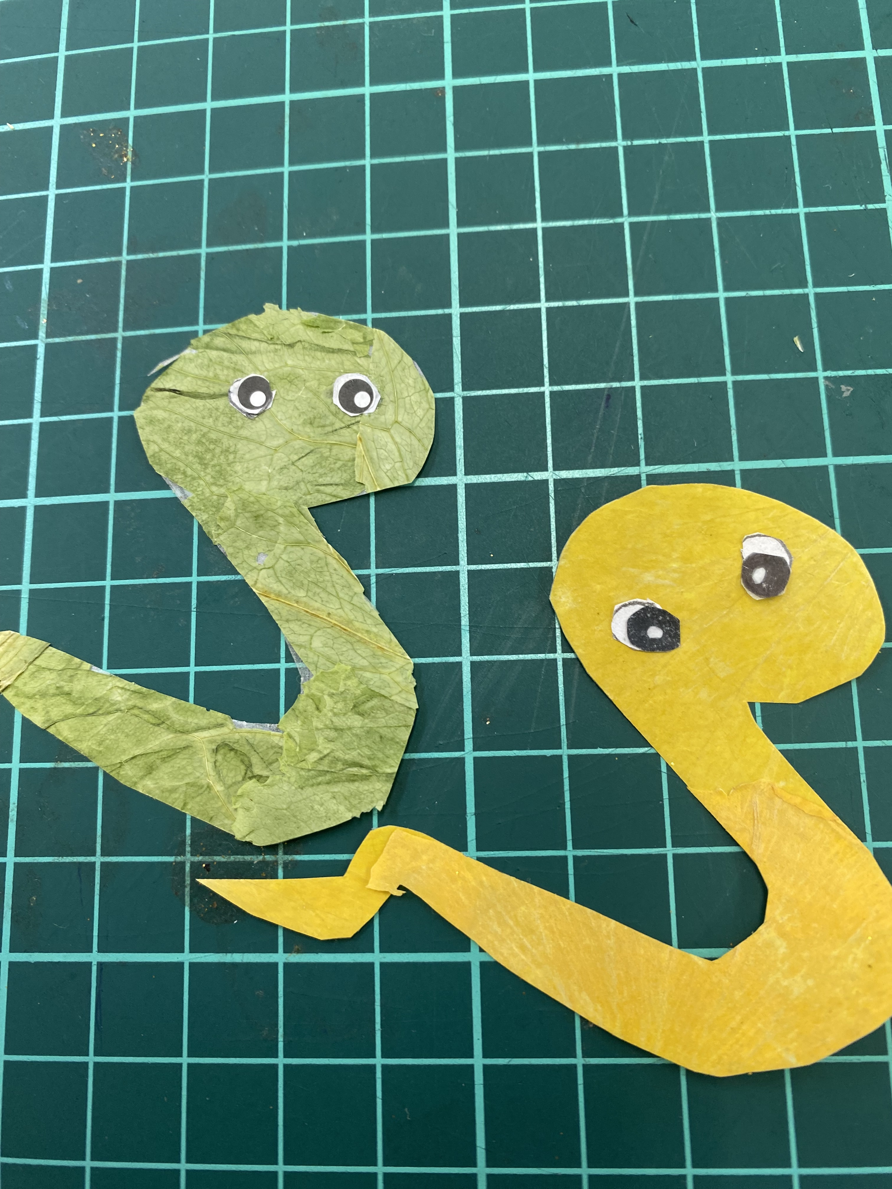 小さな蛇の形をトレーシングペーパーに写し、薄紙花シールに乗せて押し花を置いていった。胴体はまだ良かったが眼玉が小さくてとても難しかった。目玉で表情が変わってくるので可愛い蛇にしたいと思って、あれこれ目玉を工夫したものの、あまり可愛い目玉にならなかった。