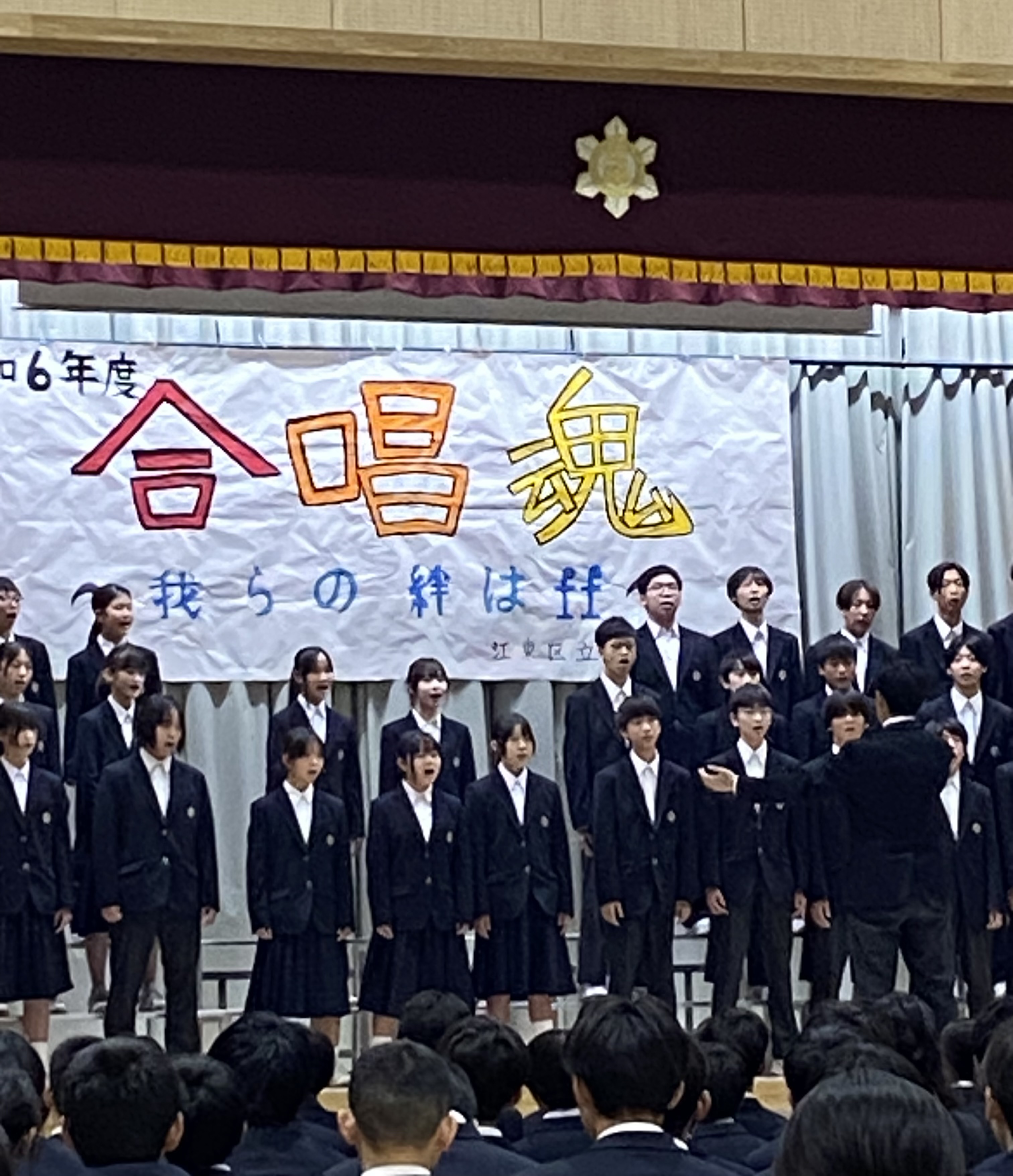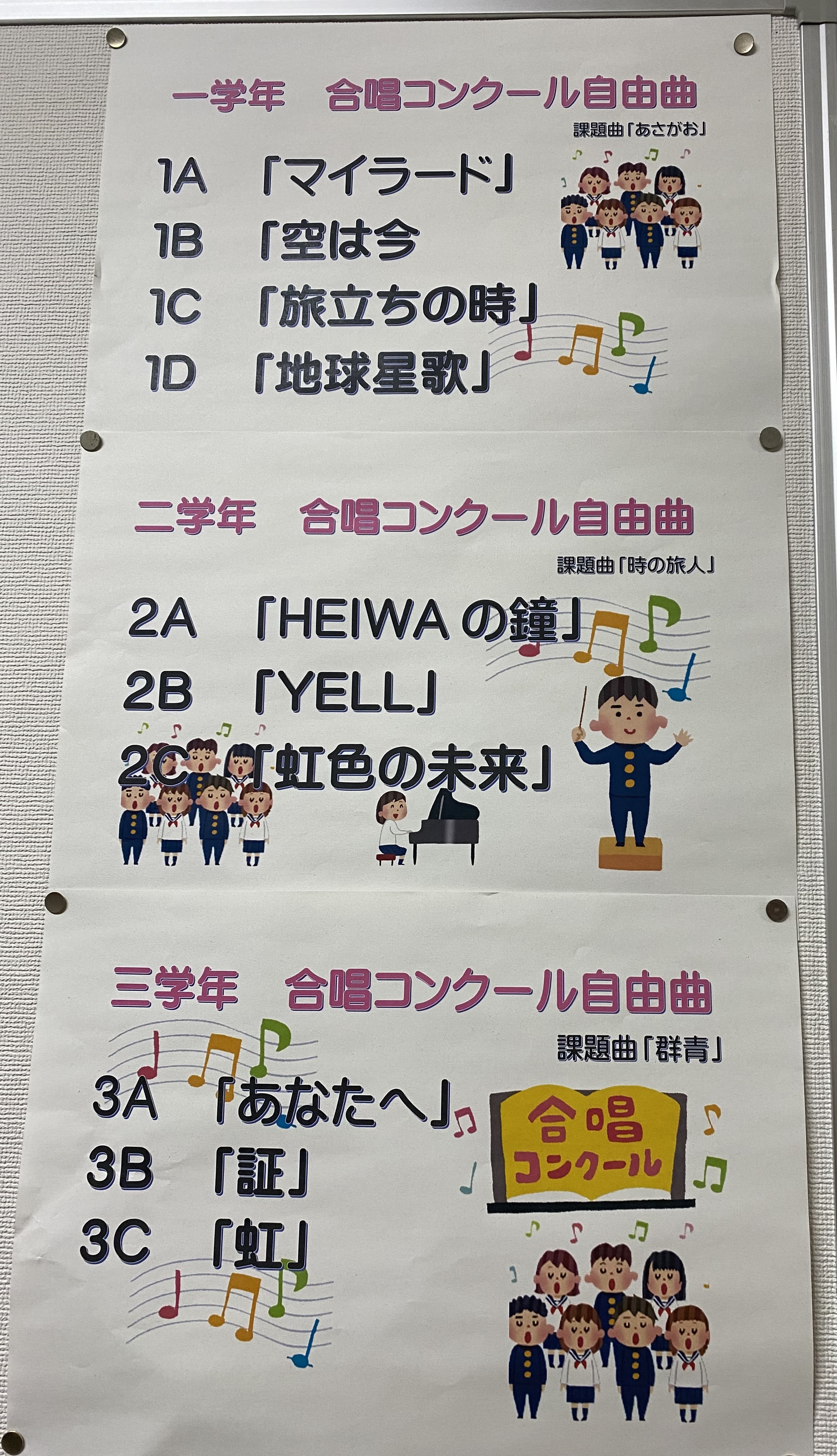 合唱コンクールは1年生4クラスで課題曲「あさがお」とそれぞれの自由曲で競われた。どの学級もすごく演奏態度が立派で合唱も一生懸命歌っていて素晴らしかった。