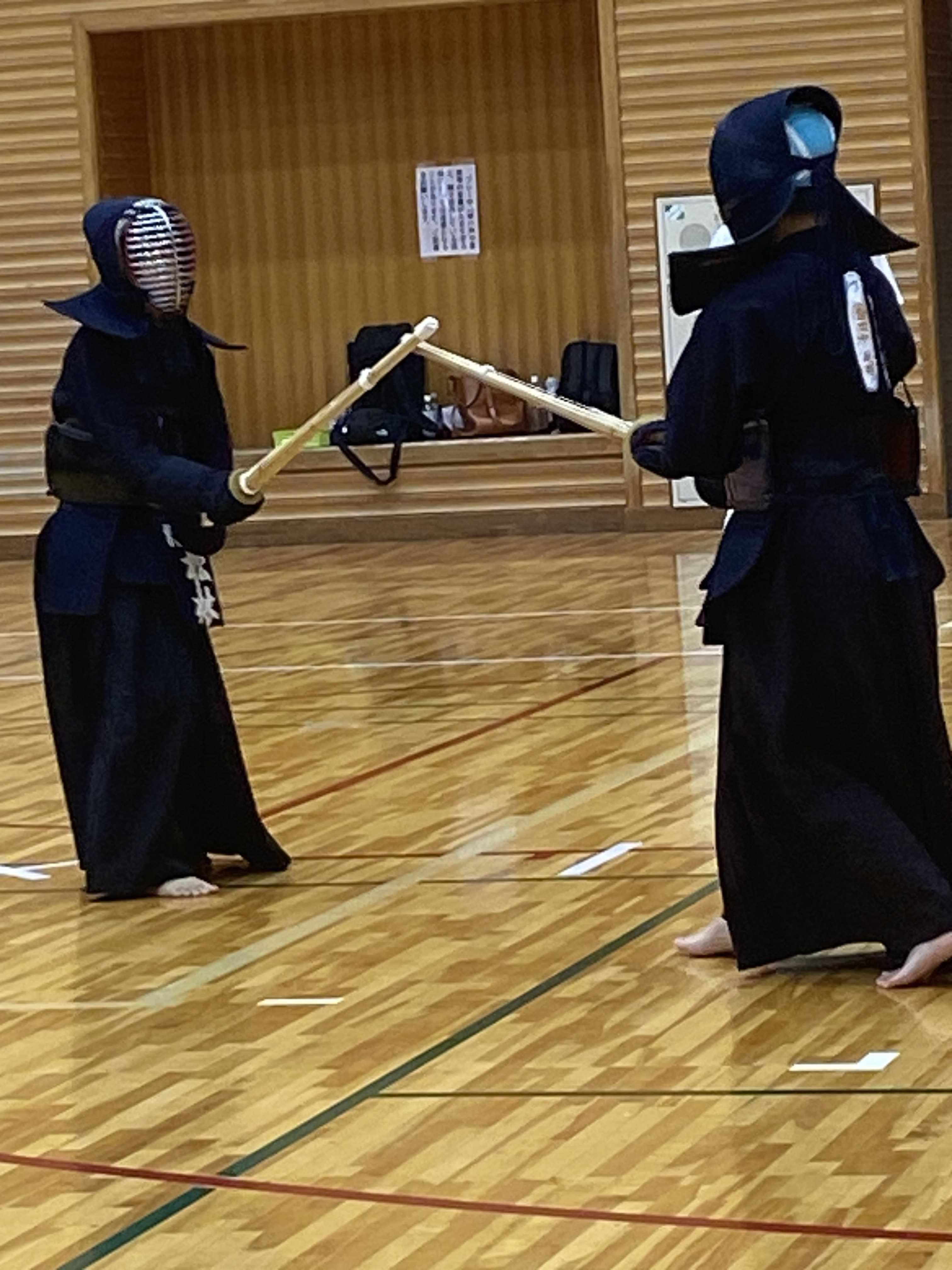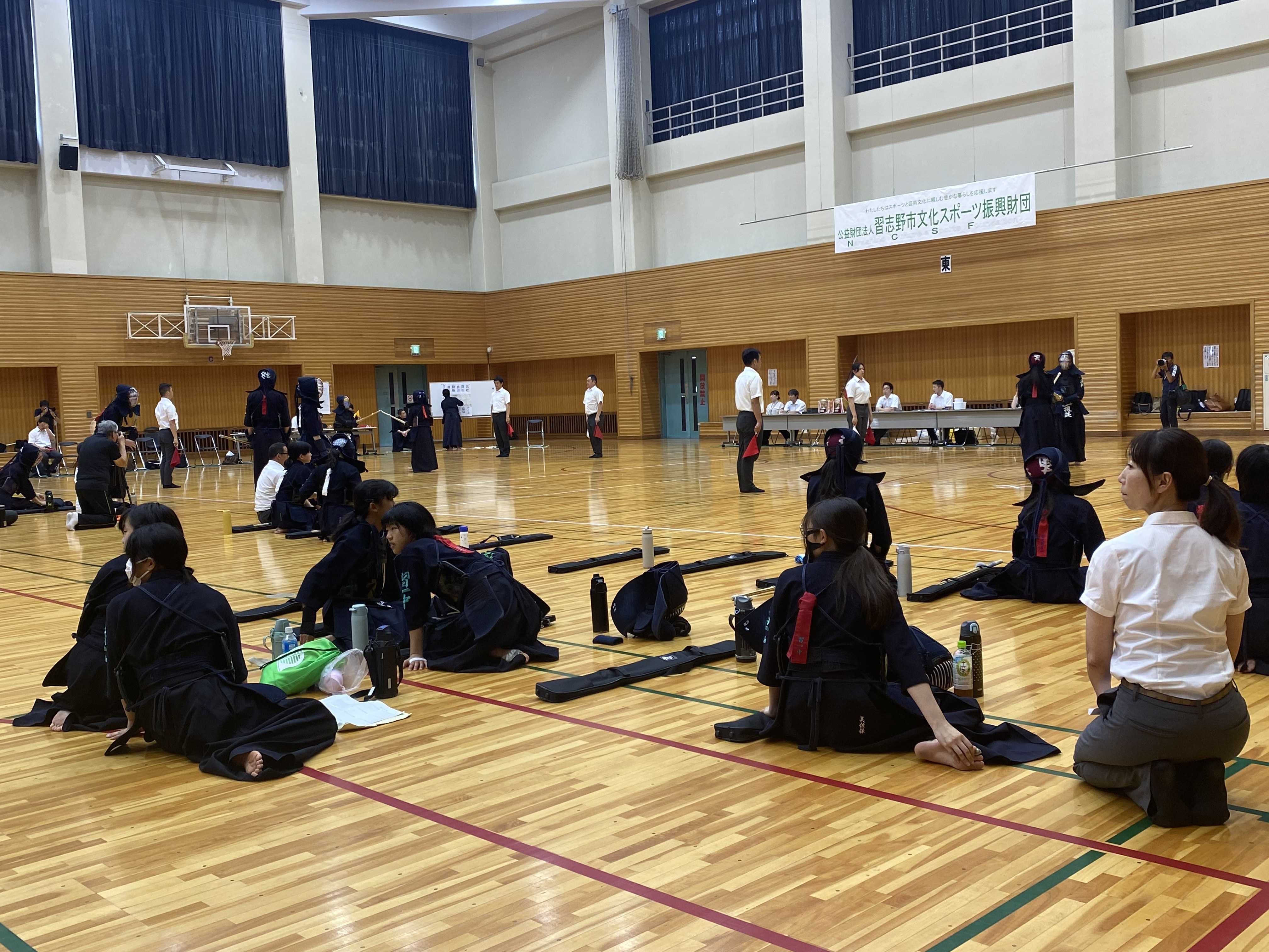 広い体育館の中で午前は団体戦、午後は個人戦が行われ、暑い中、胴着に面をつけ、シナイを持って子どもたちは奮戦していた。