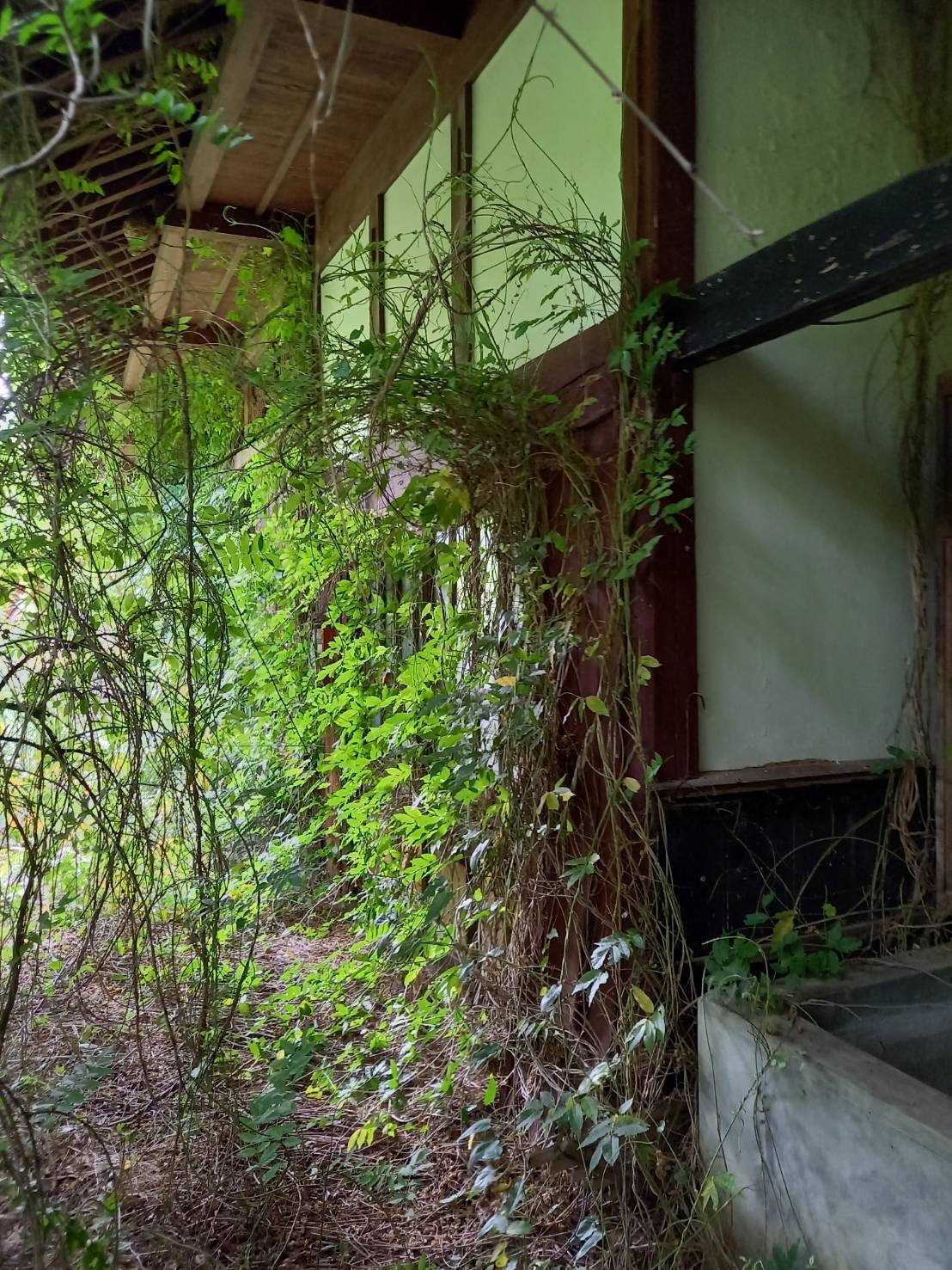 写真を見ると母屋と隠居部屋、庭などが写っている。建物はしっかりしているが、ツル性の植物が縦横無尽に繁茂していて母屋の庭いっぱいに広がり、家屋にも巻き付いている。