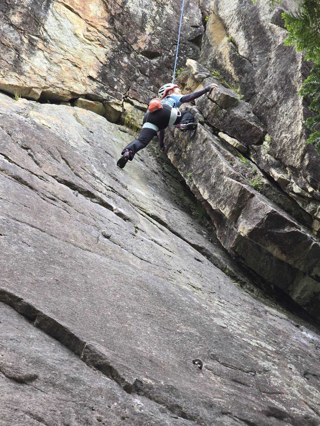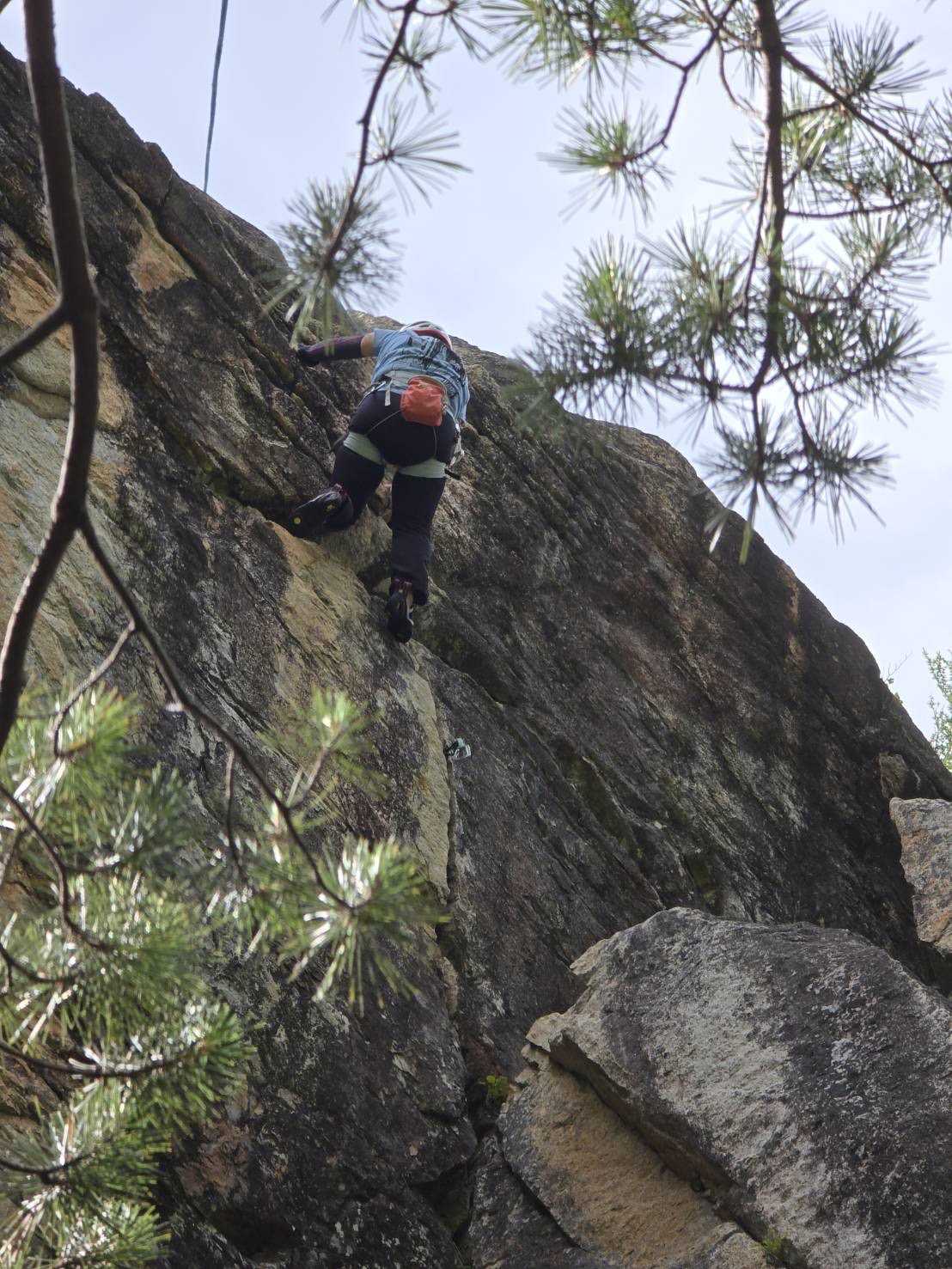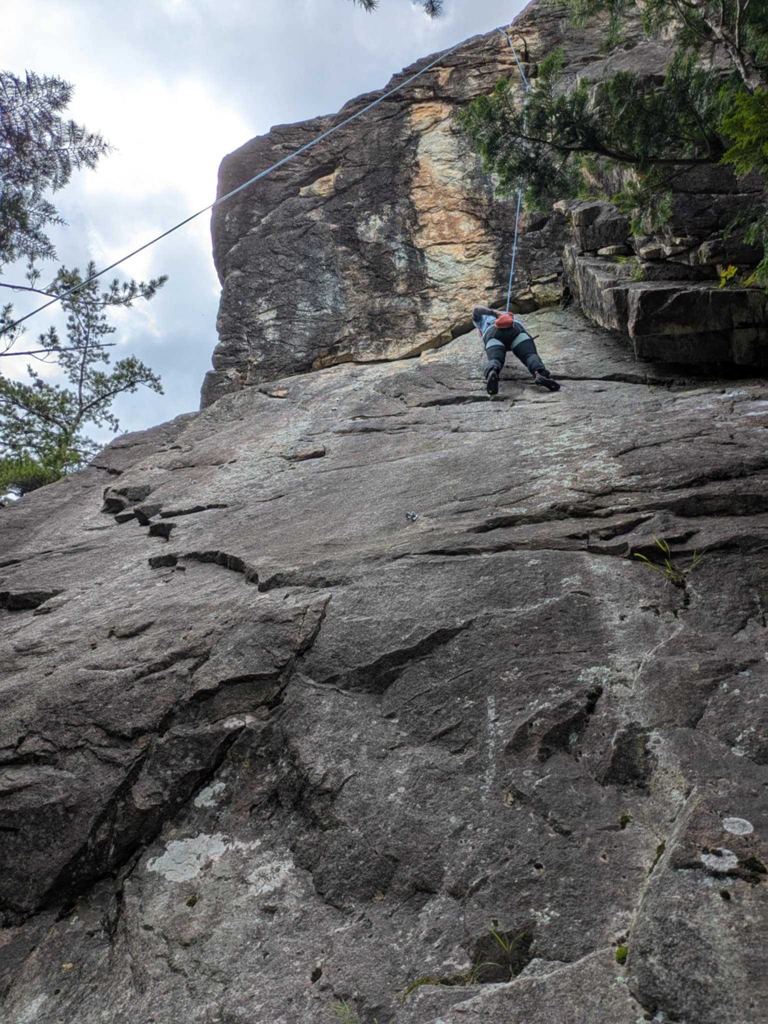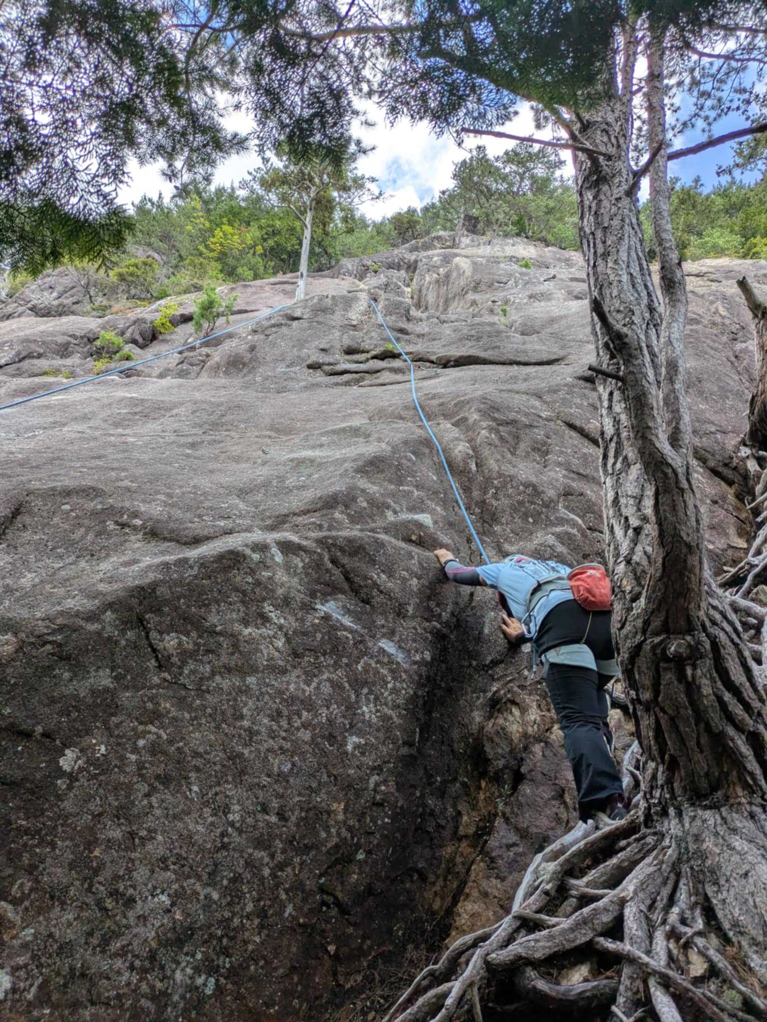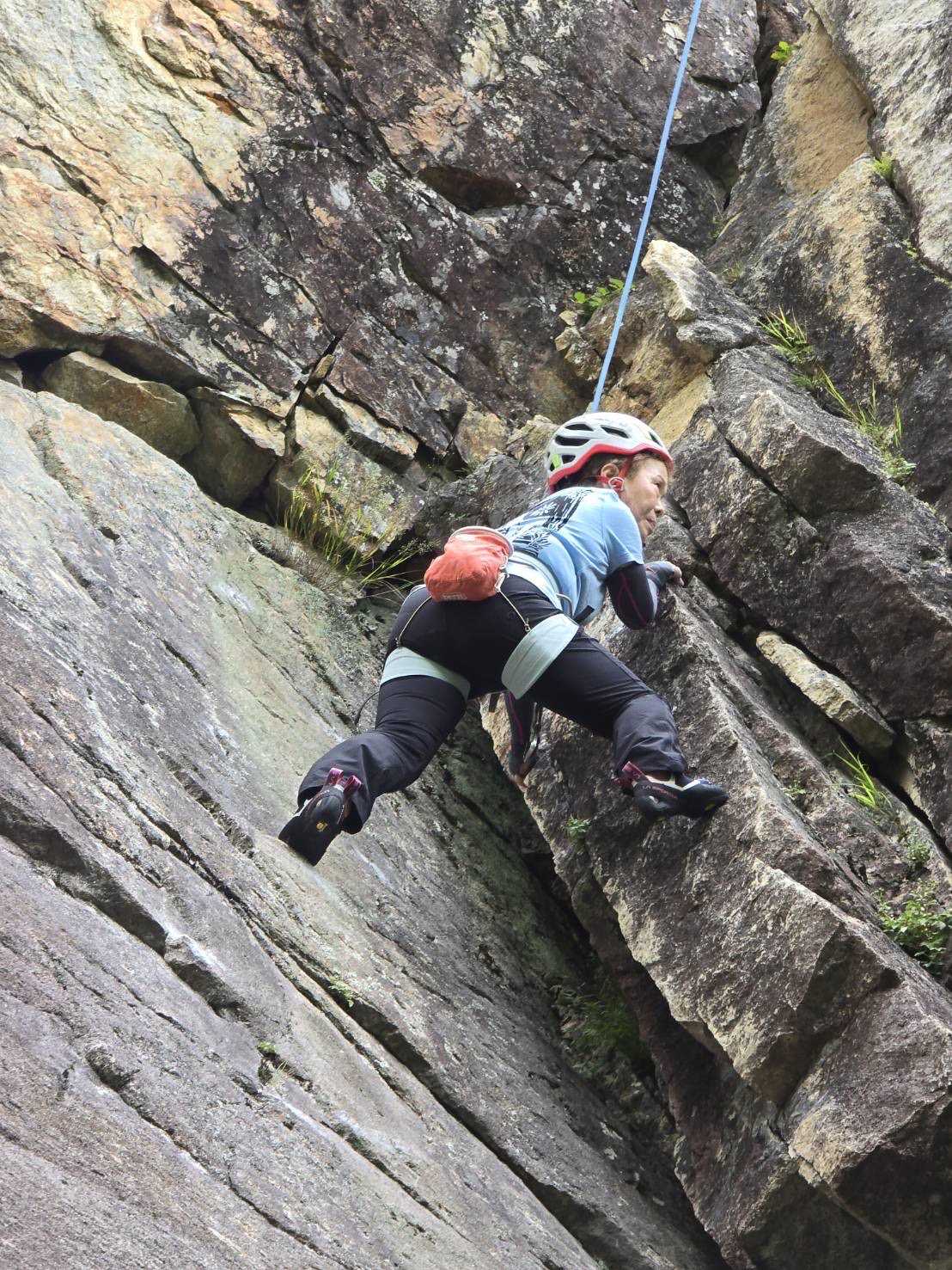 中間のお立ち台までは何とかたどり着くが、そこから被り気味の垂直のクラックが難しく、クラックに足を入れて昇る体制に持ち込むのが怖かった。思い切って出たものの、その後も奮闘続きだった。ヤレヤレだったが曲がりなりにもトップアウトしたので良しとした。