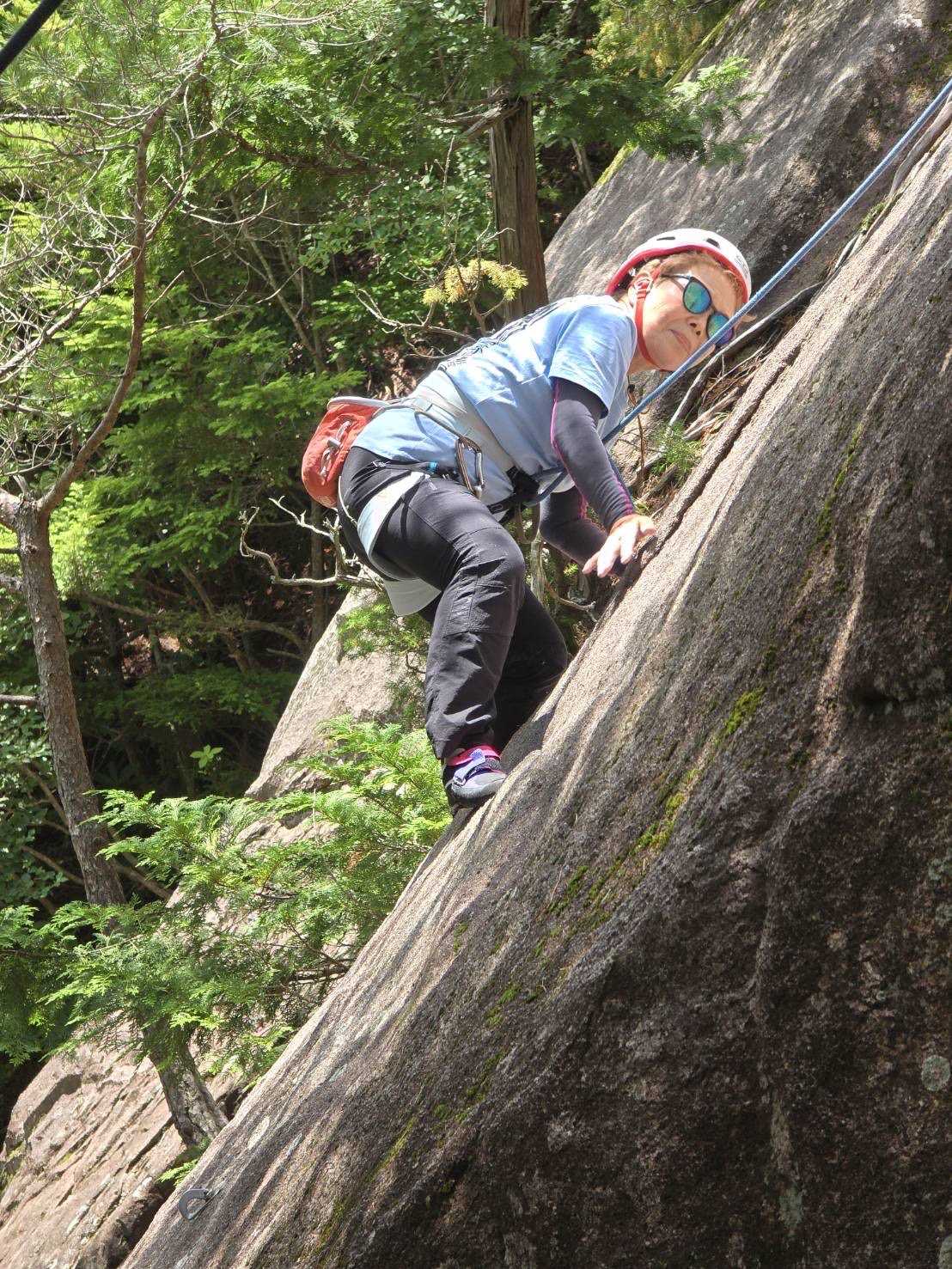 予想外のエッジの効き方、スラブの留まり方に内心驚愕した。以前の靴とは比較にならない昇りやすさで自分の力以上に昇れる。「なあんだ、みんなこんな最新のすぐれた靴で昇ってたんだ、私だけが10年前のクラシックな靴で昇っていていつもスラブで滑っていたんだ」。シューズの威力を確信し、すっかり気をよくして快調に昇った。