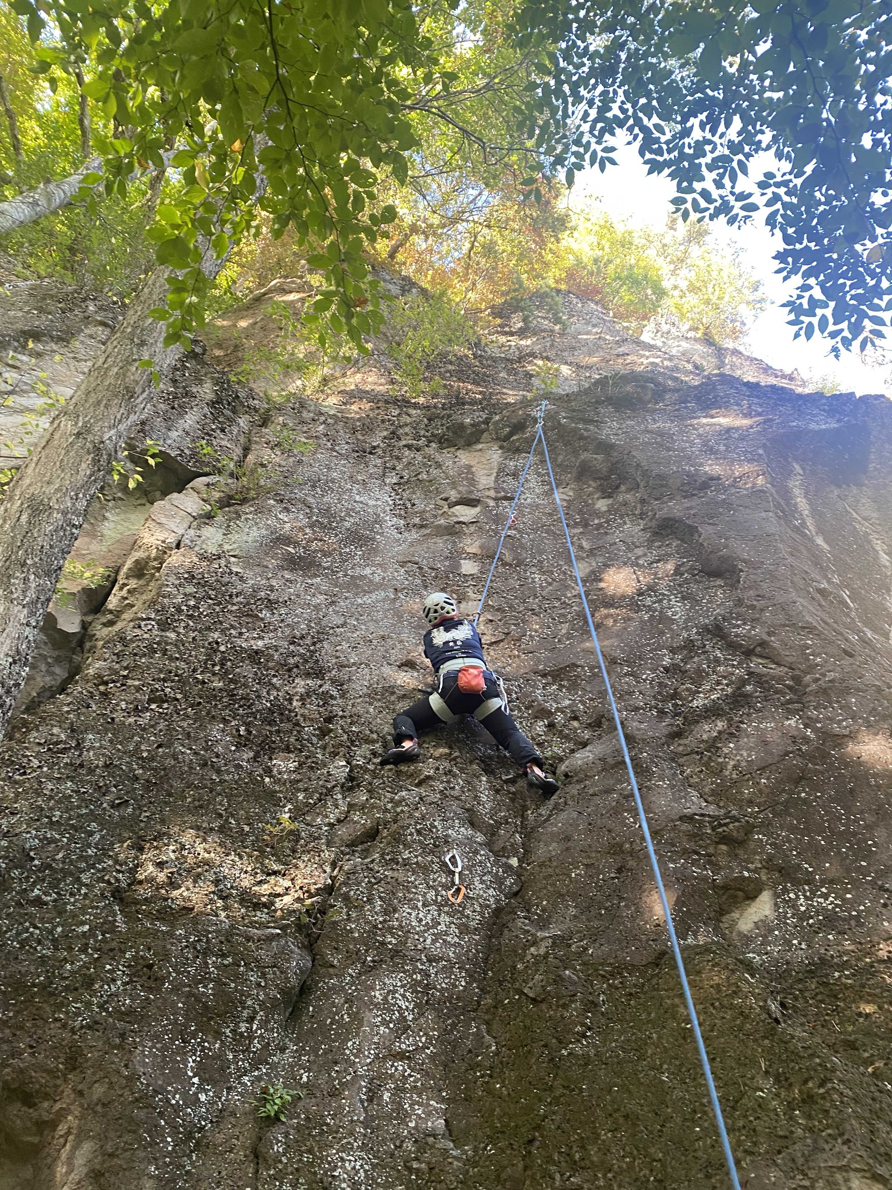 まずハイブから始めた。このルートはとても長いルートで、後半のハング気味のところでクラックに手が届かないので手こずったが何とかトップアウトできた。体が慣れない最初からここを昇るのは試練だ。