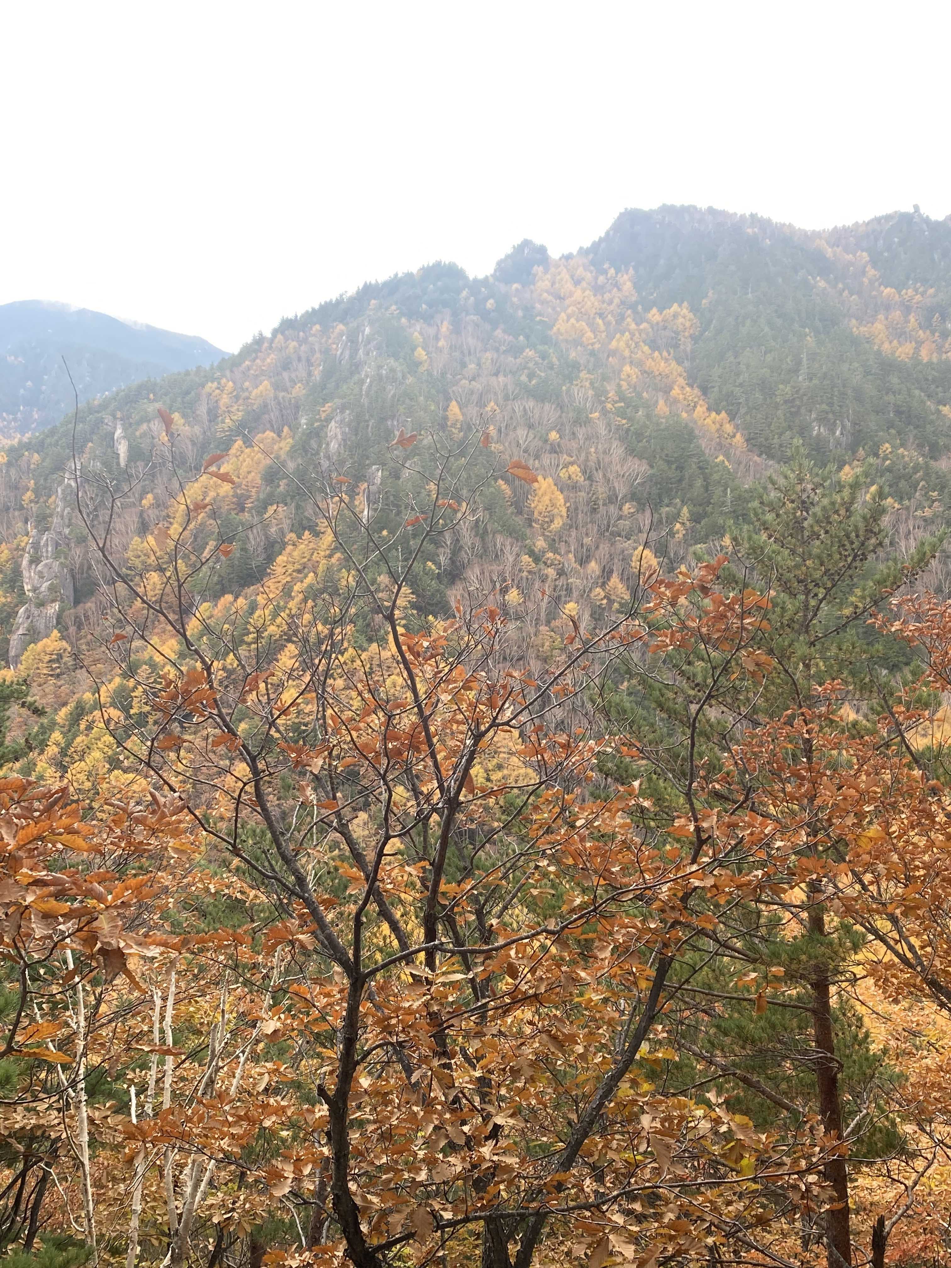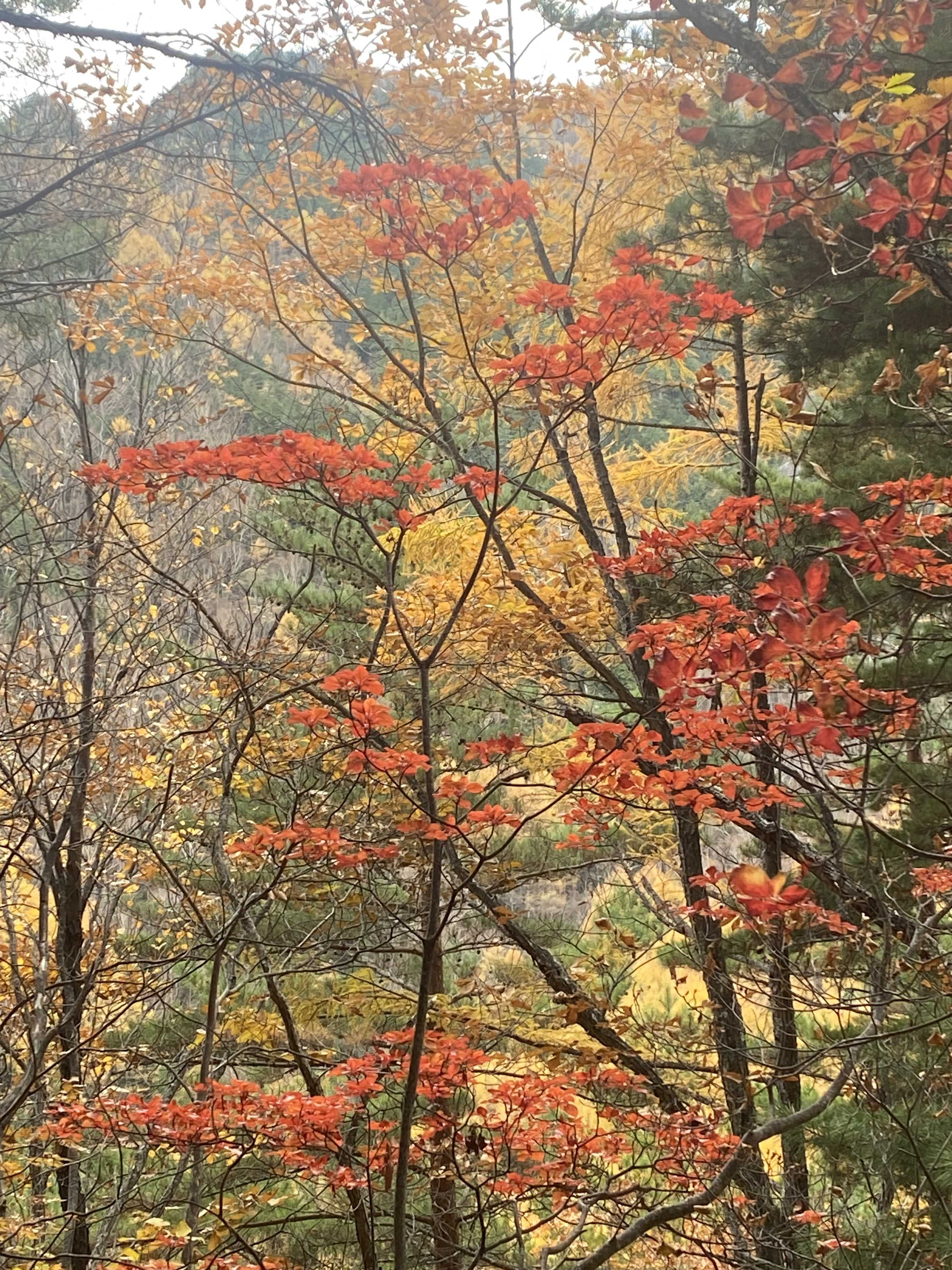 11月6日木曜日。今日から二日間で小川山にクライミングに出かけた。参加者は0さん、Mさん、IさんにSさん、お上手な方ばかりの中にあまり昇れない私が混入している。小川山は今、まさに錦秋の時、紅葉が美しく、心が潤う感じだった。この美しい紅葉の景色を観れただけでも有難かった。