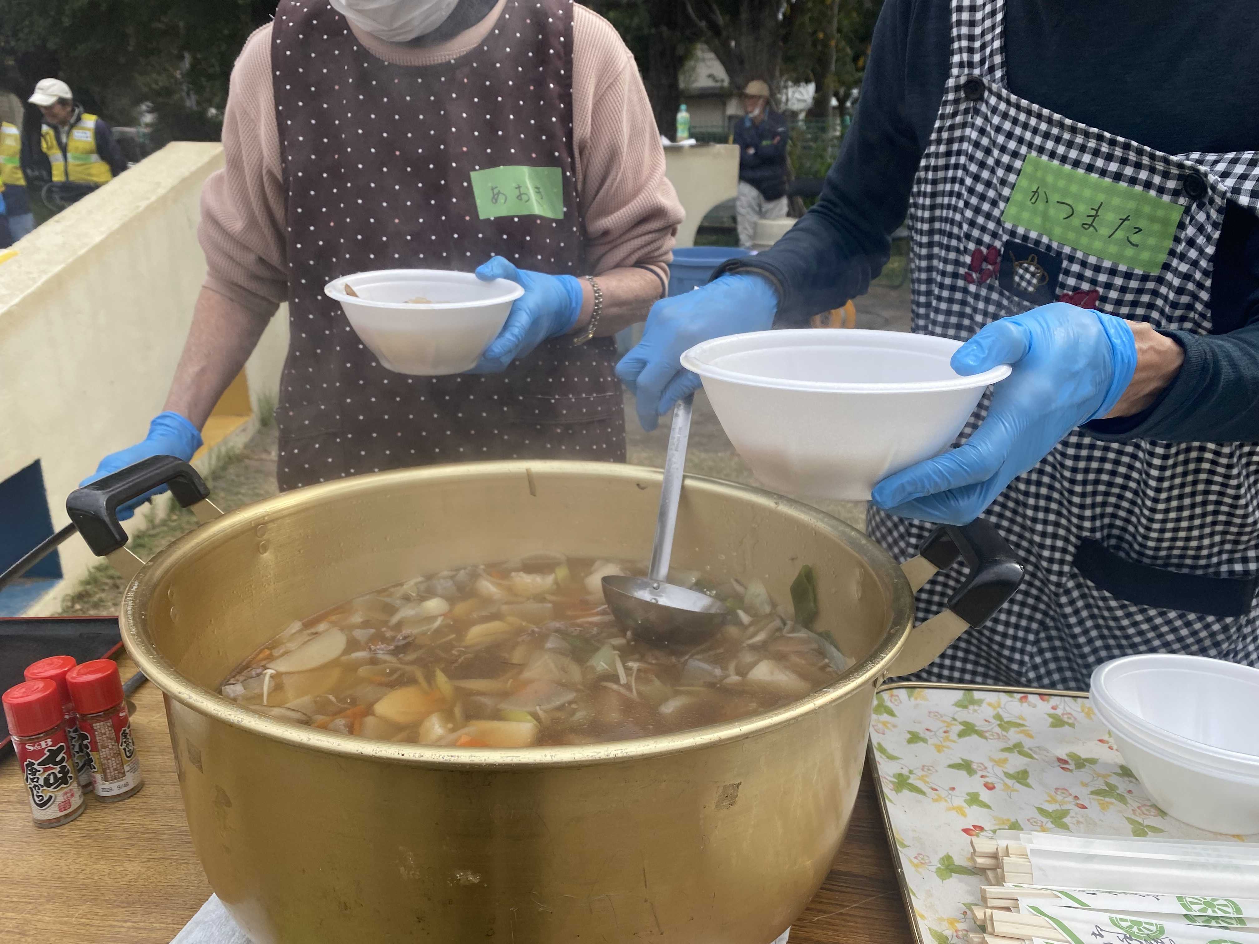 会場を歩いてみると子供向けのボールすくいや焼き鳥、焼きそば、綿あめなども屋台を出していてちょっとしたお祭りだ。婦人会みたいな皆さんによる芋煮汁の無料ふるまいがあったので、遠慮なくご馳走になった。里芋にごぼうや油揚げなど具沢山で美味しかった。