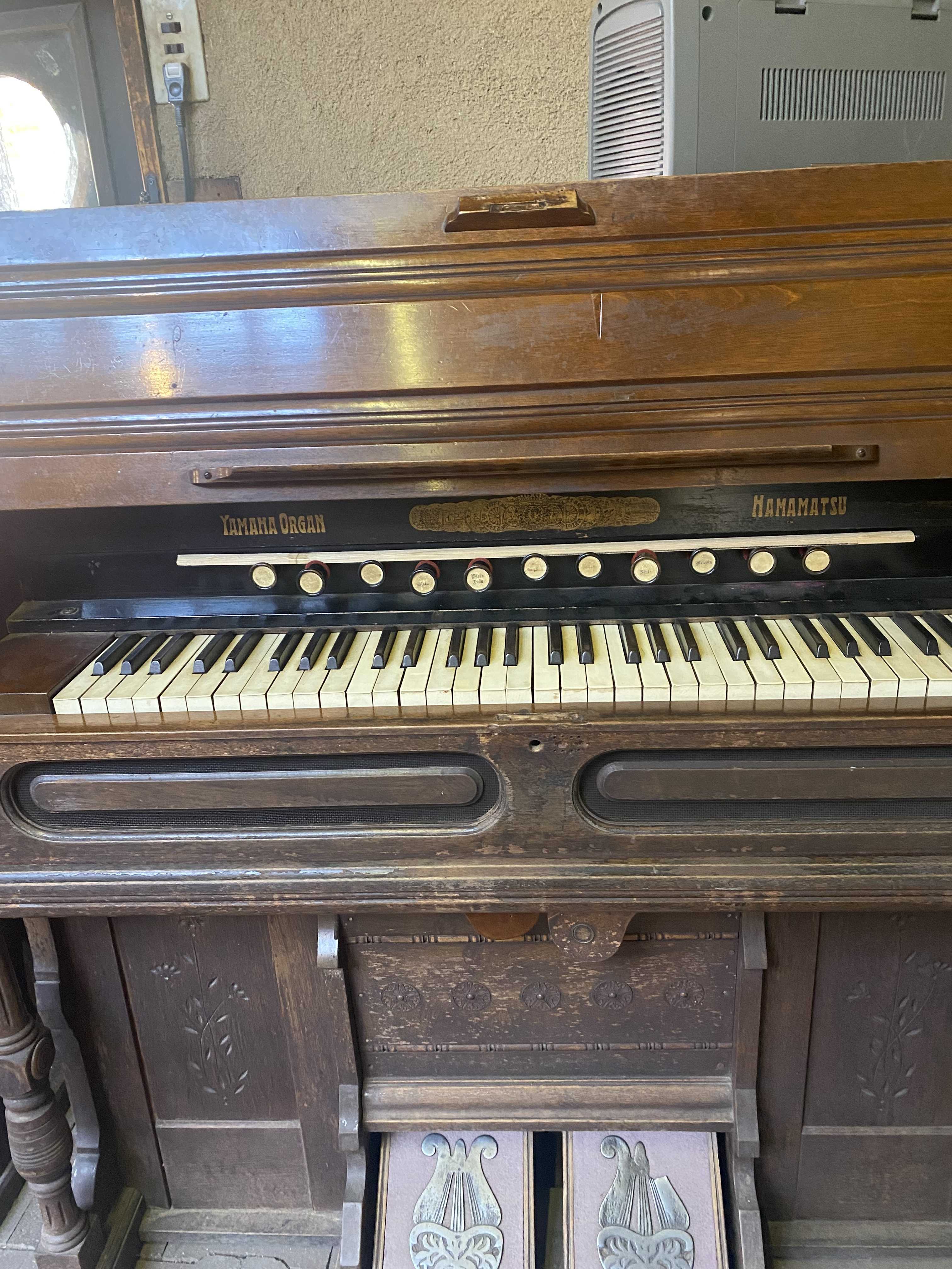 荻原守衛 作「労働者」像の横で 足踏み式オルガン