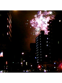 昨夜隅田川の花火大会に行ってきました。今年は30回大会ということで2000発昨年より多く花火があがったそうです。隅田川に浮ぶ屋形船に乗って花火を眺めている人々の何と優雅なことか。皆さん花火の見える場所を探して浅草駅の周辺をうろうろ、うじゃうじゃしていました。人込みの中を流れに乗って進んでみたら行き止まりだったり隅田川の桜並木やビルに遮られて音はするのに花火の姿はなかなか見えません。色の変わる夜空を眺め、響く音を聞きながら大きな花火が上がっているんだなぁと姿の見えない花火をもどかしく思いました。結局ビルの隙間や桜並木から欠けた花火を眺めました。都会のビルの隙間から花咲く花火。場所を確保しておかないと花火大会の気分だけを味わうことになりそうです。私の嫁ぎ先の町では大晦日に15発くらい花火があがります。たった15発の花火ですが「商工会頑張ったなぁ」と思います。実家の方はお嫁さんが来ると結婚式の朝に花火があがります。お嫁さんからは「恥ずかしい」と不評のようですが暖かみのある花火ですね。お嫁さんも本音はうれしいんじゃないかな。ビルで欠けた花火でしたがとてもきれいで、十分に夏らしい気分を味わうことが出来ました。上の写真は夫が撮ったものですが、下の写真は私が同じところで写したものです。ビル爆破?!テロじゃありませんよ・・・。ひどいもんです・・・。