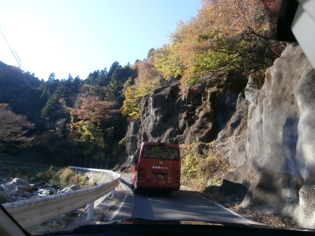 紅葉狩りに行ってきました。道路が狭い~。右は崖。左は石がゴロゴロと並んでいる清流があります。 対向車が来たら、道の太い所に停まってお互いに道を譲りながらすれ違います。 ドライブは楽しいね。