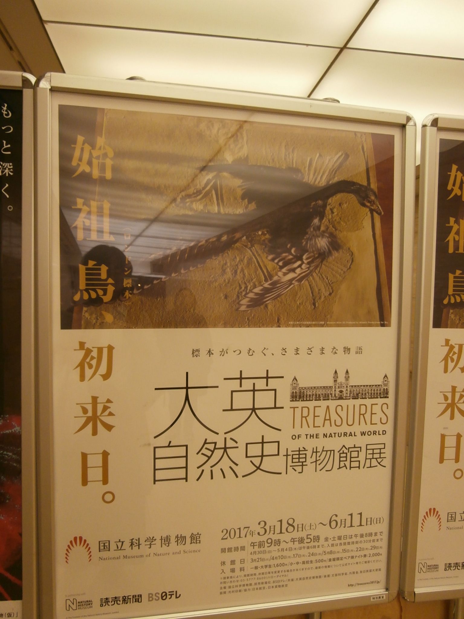 国立科学博物館で開催されている『大英自然史博物館』に行ってきました。目玉は「始祖鳥」です。始祖鳥は教科書に掲載されているので必ず見たことがあるはずだと雑誌に書いてありましたが、私には記憶がございません。その教科書に掲載されている始祖鳥が初めて大英博物館を出て東京にやってきました。私のへなちょこカメラではこれが限界。ですが、きちんと羽が生えた尾っぽがわかります。うなぎイヌのような尾っぽだなぁ。未だに飛んでいたのか、飛べなかったのか分からないそうです。CTを行った結果、視覚野がよく発達していたことがわかり多分飛んでいたのだろうと推測されています。会場に入った途端現れたキリンの首のはく製。大英博物館では10頭くらいの首が並んでいるようですよ。これは猫のミイラ。先端の丸いところが頭です。きちんと猫の耳の形に布が折ってあり顔も書いてありました。頭の所に2色で縦じまの模様が書いてあったので「トラネコ」か???わらわら群がっている三葉虫。目玉のようなサファイア。31.5カラットもあります。 ほしい~。日本に飛んできた隕石。そのうちの一つはイギリスにあります。日本にあった隕石はどこかの大名屋敷にあったようですが、火事のごたごたで紛失しています。今頃どこかで漬物石になっているかもね。鉱石 「輝安鉱」かっこいい!宇宙的。日本で採取されました。海底の熱水鉱床から生まれるそうです。一番混んでいたのはここでした。ダイヤモンド(レプリカでしたが)ひかり輝く宝石は見ごたえがあります。鉱物色々。真ん中の金色の鉱物は「金」です。ダーウィンが飼っていたというカメのはく製も来ていました。小さいカメがそうです。ダーウィンのカメで驚いていたら貴重な『種の起源』の直筆原稿も展示されていましたよ。字がきれいでした。読めませんでしたが。氷河期に絶滅してしまった「オオツノジカ」の頭骨標本。片方の角に人が乗って寝れるほどの大きさでした。氷河期以前の生物の大きさにびっくりします。どうしてこんなに体が大きかったのでしょう?氷河期にならならなければ今頃はどんな地球になっていたのでしょうね。ネアンデルタール人のゲノム。粉になっています。ネアンデルタール人は優しかったという話を聞いたことがあります。。遺骨の上に8種類の花の花弁や花粉が見つかり、埋葬時に献花したのではないかと言われています。一方で脳は大きかったが知能は低く乱暴だったのではという話もあります。いかにも骸骨というガイコツ・・・なんと600万年前の化石です。ピルトダウン人の頭骨類。偽物の人骨です。オランウータンと人間の人骨をミックスして作ったねつ造の人骨は40年間もの間本物と思われていました。顎関節など判別するために大切なことろが欠損しており実に巧妙な標本なのだそうです。反省材料として展示されています。地球上において貴重な標本をじっくり見ることが出来ました。整理券が配られ指定した時間に行けば並ばずに入館できるように配慮されていますが、昼間は大変混んでおりゆっくりと展示を見ることが出来ないようです。金・土曜日は20時まで開館しています。私は土曜日の18時に入りましたが、混雑なしでじっくり展示を見ることができました。GW中も特別に時間延長しているようです。国立科学博物館の他の展示室は貸切状態でしたよ。ナイトミュージアムみたいで楽しかったな~。