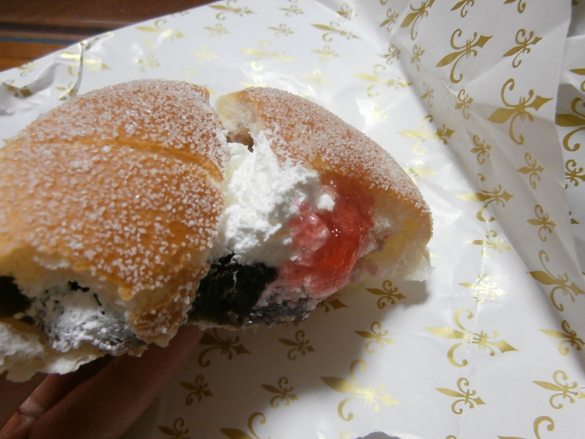 パンの表面に粉砂糖がふられており。中にはあんことホイップクリームとイチゴジャムが入っていました。甘い~。これで120円という安さ。
