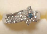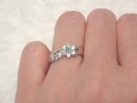 プラチナ900に、ダイヤモンド0.5ct♪真ん中のダイヤモンドはトリートメントした青いダイヤ、と当時お店で聞いたときはまだトリートメントダイヤのことは聞いたことがなくて、「そんなダイヤがあるなんて(☆-☆)、、青い~(☆-☆)」とうっとり嬉しくなったのでした。