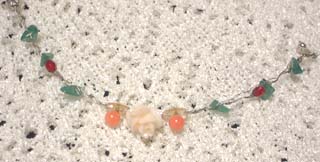細いウェーブワイヤーを三本束ねて、バラに合うのはやっぱり葉っぱの色かな?と緑の翡翠(?だっけ?アベンチュリン?、、とりあえずビーズ屋さんに売っていたさざれ石)をあちこちに留めてみました。留めるのも、少しイレギュラーな雰囲気にしたくて、三本のワイヤーのうち二本だけに留めてみたり、一本だけに留めてみたり、、一色だけアクセントの挿し色が欲しくて真っ赤なスワロフスキービーズも留めてあります。