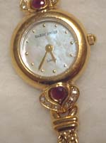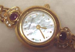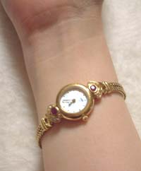 マザーオブパール?な雰囲気の文字盤に、ルビーっぽい&ダイヤっぽい石の飾り、ロープ状のベルト、と全部がお気に入りなデザインなんです(^^)♪