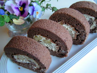夫が休日出勤&来週は私がハードスケジュールなので、今日は一日のんびり家で過ごしました。おやつは、息子のリクエストでまたロールケーキ。今日はキャラメルとカカオのお菓子のレシピで、ココア生地にキャラメルクリーム入りの生クリームを巻いたものです。そろそろ限界という感じのバナナが残っていたので、それも刻んで巻きました。この生地はメレンゲを立てた後、卵黄をそのままポンポン加えていくという作り方。先日のケーキ教室でもこの方法でした。別立てのビスキュイ生地よりもしっとりしていて、共立てよりもココアを混ぜても泡が消えにくく、しっかり膨らんでくれるという、両方のいいとこどりをしたようなこの生地、しっとりふわふわでかなり気に入っていますキャラメルとカカオのお菓子