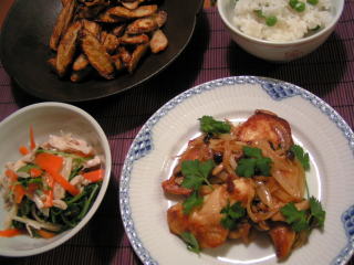 てんきち母ちゃんちの毎日ごはん(2)のレシピでは鶏むね肉で紹介されていたおかずです。今回は、かじきで試してみました。かじきだけではちょっと量が足りなかったので、冷凍してあった鶏のささみも出動。炒めた玉ねぎの甘さと、カレー粉とマヨネーズをあわせたコクのあるソースの相性がばっちりで、淡白なかじきもささみも、しっとり柔らかく、おいしくいただけました♪出かけたついでに、ちょっと遠くのスーパーで買い物をしたら、早くもグリンピースが売っていました。まだまだ寒いけれど、食卓の上だけでも少し早めの春の気分で、豆ごはんを炊きました。娘は警戒して、一口ごとにグリンピースが入っていないかチェックしていたので、かなり時間をかけて食べていました(^o^;豆ごはんならいらない!というわけではなく、ご飯は食べたかったらしい・・・。小鉢はゆでた水菜、にんじん、えのき、鶏ささみを合わせてポン酢をかけたもの。鶏肉が入ることで、子供たち(夫も?)の食いつきがぐっとよくなりますもう一品は揚げごぼうの甘辛。てんきち母ちゃんちの毎日ごはん(2)のレシピで、下味をつけて片栗粉をまぶして揚げたごぼうに、甘辛いたれを絡めています。素揚げにするよりも表面のカリカリ感がアップするので、子供たちにも大好評娘は夫に残しておいた分まで食べそうな勢いでした(;^_^Aてんきち母ちゃんちの毎日ごはん(2)