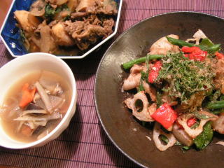 昨日は2種類の中華まんでお腹いっぱいになってしまい、かなり売れ残ってしまった韓国風肉じゃが。今日はリメイクもせず、そのまま再登場です(;^_^Aあとは、副菜に野菜をたっぷり使った揚げ浸しとスープを作りました。揚げ浸しは、れんこん、ピーマン、いんげん、大根を素揚げし、市販のめんつゆ+ポン酢を合わせた漬け汁の中へ漬けたもの。食べる直前にしその千切りとかつおぶしを散らしています。スープはたかこ@caramel milk teaさんのおもてなしランチ会のらくちんメニューブックのレシピで、ごぼう、にんじん、大根、椎茸を鶏がらスープで煮て、軽くおしょうゆと塩で味付けしたものです。意外にもこの地味なスープが娘にウケて、野菜をたっぷり食べてくれました(*^_^*)寒いせいか、このところスープがブームのよう。野菜がとれるし、汁物を飲むとほどよく満腹感が得られるので、ママにもよさそう~たかこ@caramel milk teaさんのおもてなしランチ会のらくちんメニューブック