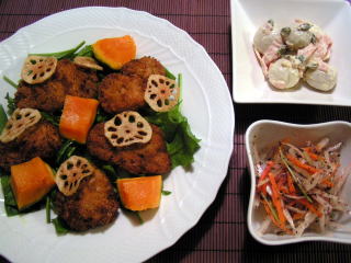 土日は夫も一緒に夕食をとれるので、できたてを食べたい揚げ物がよく登場します。今日はウスターソースとカレーパウダーで下味をつけて揚げたヒレカツ。Yomeの楽チン・レシピを参考にしています。しっかり下味をつけてから揚げるので、食べるときにはソースいらずでした。ただ、下味がついている分、ちょっと焦げやすかったですソースの酸味のおかげか、とても柔らかくて、お箸でちぎれるくらいのカツは、かたまり肉が苦手な子供たちにも好評でしたカツを揚げるついでに、薄く切ったレンコンも素揚げにして添えました。ポテトチップス感覚で食べられるので、これまた子供たちの大好物♪大人の分がなくなってしまいそうな勢いで、兄妹2人して食べていました。あとは、サラダほうれん草と、かぼちゃにバター&粗塩をのせてチンしたものを添えました。小鉢は、大根、にんじん、セロリを梅入りゆかり&オリーブオイルで和えたさっぱり系の一品。もう一品は冷凍の里芋をチンして、ハムと柚子胡椒&マヨネーズで和えたもの。こちらは、てんきち母ちゃんちの毎日ごはん(2)のレシピを参考にしました。