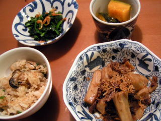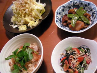 てんきち母ちゃんちの毎日ごはん(2)のレシピで、長芋の炊き込みご飯にしました。レシピを見たときには、炊き込みご飯に長芋?!と思いましたが、これがなかなか美味しい 油揚げや鶏肉もいい味出しになっていて、味見をして「これはイケル!」と、思わずどんぶりに盛り付けてしまいました(^o^;一応メインのおかずは、鶏肉とれんこんの煮物。圧力鍋の絶品おかずを参考にしました。圧力鍋でがっと煮るので、大ぶりに切ったれんこんも短時間でしっとり柔らかに。私はシャキシャキした歯ごたえのれんこんも好きなのですが、子供たちには、こういうしっとりれんこんが食べやすいようで、たくさん食べてくれました♪あとは、おくらとプチトマト、きくらげのごま酢和えに、白菜のオイスターソース和え。おくらはごま酢は大好きな組み合わせ。今日はすりごまだけでなく、練りゴマも入っているので、さらにコクがアップ。白菜のほうは、その日のうちに食べるとサラダ風で、翌日塩気が回って、白菜の水分が出ると、お漬物風に。私は味のよくしみた漬物風が好みですてんきち母ちゃんちの毎日ごはん(2)圧力鍋の絶品おかず