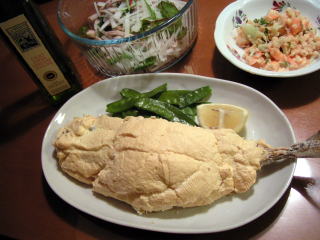 今日もお昼がちょっとヘビーだったので、夜は魚の気分だな~と思いながら買い物に出たら、あじが激安で売っていたので、即決一見手間がかかりそうに見えますが、お腹ににんにくとローズマリーを詰めた魚を、泡立てた卵白に粗塩をたっぷり加えた塩釜で包んでオーブン任せで焼くだけなので、焼き魚のようにじっと見張っている必要もなく、その間に他のおかずに取り掛かれます♪塩釜焼きというと、レシピに「塩1キロ」などと書いてあって、主婦感覚からするとちょっと躊躇してしまいますが、行正り香さんのだれか来る日のメニューのレシピでは、卵白を泡立てるというひと手間がありますが、塩がぐ~んと少なくて済むので、主婦としてはなんとなく安心感があります卵白4個分の泡立てはクィジナートを使ったので、今までの半分くらいの時間で済みました。塩釜焼きにするとしっとりと仕上がるので、子供にも食べやすいようです。オリーブオイルやおしょうゆ、レモン汁をかけていただきました。サラダはカリフラワーとむきえび、トマトをマヨネーズで和えたものと、ローストポークの残りを千切りにして、大根やベビーリーフと和えて、成城石井の玉葱ドレッシングで和えた、残り物リメイクサラダです(;^_^Aだれか来る日のメニュー