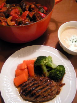 本屋さんで、何気なく手に取った枝元なほみさんの圧力鍋の絶品おかず。作りやすそうなレシピがいっぱいで、他の本を買うつもりだったのに、その場で変更して、こちらの本を買うことに。圧力鍋のお料理本というと、お肉をまるごとどかーん、とか、まとめ作りに便利ですよ、みたいなものが多くて、うちの食生活のスタイルとは合わないなぁと感じるものが多かったのですが、この本は野菜もたっぷり使ったレシピが多く、日々のご飯作りに役立ちそうです。圧力鍋は毎日のご飯炊きに使ってはいるものの、イマイチお料理には使いこなせていなかったので、ちょっとレパートリーを広げられるといいな~。そのお料理本で作ったのがこちらのラタトゥイユ。(圧力鍋でご飯を炊く都合上、出来上がり後は中身をルク鍋に移しています。)時間短縮はもちろん、たくさんの野菜もムラなく柔らかくなっていて、今更ながら便利だなぁ~と感心しました。メインはハンバーグとにんじんのグラッセ、塩茹でのブロッコリー。あとは、かぶのクリームスープ。かぶをにんにく、ベーコン、玉ねぎと一緒に炒めて、コンソメスープを加えて煮たあと、ミキサーにかけてからお鍋に戻し、牛乳と生クリームでのばしたもの。かぶの淡白な味をにんにくとベーコンが補ってくれて、とても飲みやすい味になっています圧力鍋の絶品おかず