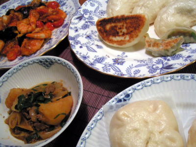 今日のお昼は、先日のリベンジで餃子まんにしようと思っていたのですが、夫が休日出勤だったため、晩ごはんにすることに。ほんのりしあわせ。おうちパンのレシピです。餃子の具を入れた中華まんを蒸した後、フライパンで焼き目をつけます。巨大な餃子型の中華まんの完成具が余ったので、ノーマルな餃子も少しだけ。並べるとその大きさの差がわかるでしょうか?手前の中華まんは豚角煮まんです。少し甘めの角煮が我が家好みの味で、家族イチオシの味です。あとは、韓国風肉じゃがとなすやプチトマトの入ったエビチリ。どちらもてんきち母ちゃんちの毎日ごはん(2)のレシピです。このエビチリは野菜がたっぷり入るので、少しのエビでもできて、助かります♪