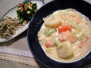 またまた、圧力鍋の絶品おかずのレシピです。圧力鍋で加熱したじゃがいもは、いつもと同じスーパーのものなのに、おどろくほどほくほくで美味しかった~実家のクリームシチューには、なぜか白菜が入っていることが多かったのですが、ふとそれを思い出して、加圧終了後、ゆでて水気を切った白菜を加えてみました。白菜とクリーム味ってとても相性がいいですよね。大好きな組み合わせです。サラダは我が家の定番、ごぼうと鶏むね肉の酒蒸しをごまマヨネーズで和えたものと、ゆでたほうれん草と角切りにしたクリームチーズを生クリーム&めんつゆで調味し、ローストしたくるみを散らしたもの。お浸しだと夫も子供も食べないので、ほうれん草の調理法にはいろいろ工夫が要ります(;^_^A* * * * * * * * * * * * * * * *ランチョンマットは吉祥寺のNatural Kitchenで買った1枚100円の無地のものに、同じお店で買ったレースを縫いつけて作りました。残ったレースは娘のパンツの裾やポケット部分にあしらってみました。工作感覚で出来る、このくらいのお裁縫が私の限界(^o^;圧力鍋の絶品おかず