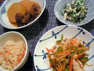 ちょっとお疲れ気味の胃腸のために、野菜たっぷりのあっさりメニューです。牛スジと大根の煮物はぶり大根に次ぐ、我が家の定番メニューとなりつつあります。牛スジは一度ゆでこぼして洗い、圧力鍋で柔らかくなるまで下ゆでをしています。ひと手間かけることで、安い牛スジ肉が柔らかく美味しく変身♪大根も下ゆでをしてから、牛スジと一緒に薄味の煮汁で煮込んでいきます。牛スジのだしが出ている煮汁も、スープのように美味(*^_^*)ご飯は名古屋からの帰路の富士川のサービスエリアで買った桜海老の炊き込みごはんです。生の桜海老は初めてだったのですが、桜海老だけで十分に味が出て、驚きでしたこちらではなかなか生の桜海老は手に入らないので、また機会があったら買って来よう!と思います。メインは豚しゃぶ肉の南蛮漬け。玉ねぎ、ピーマン、にんじん、セロリなどのたっぷりの野菜と一緒に、和風の漬け汁に浸してあります。小鉢はほうれん草とエリンギの白和え。以前、講習会で習ったレシピを愛用しています。すりごまとマヨネーズ入りのコクのある和え衣で、味がぼやけることなく決まります