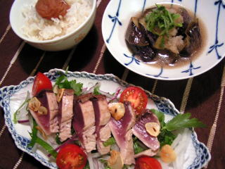 鰹のお刺身が安く手に入る季節になって、我が家は息子がお刺身好きなので、頻繁に食卓に登場しています。画像は先日作ったかつおのたたきサラダ。スライスしたにんにくをごま油で炒めてカリカリにして取り出し、そのあとの油でかつおを焼いています。たたきといってもフライパンでかつおの周囲を焼き付けるだけなのでとても簡単♪千切りにした大根やさらした紫玉ねぎ、プチトマト、しそなどと盛り合わせて、ポン酢とごま油を合わせたドレッシングをかけています。煮物はなすの揚げおろし煮。一度揚げたなすを甘辛味の煮汁で煮て、仕上げに大根おろしを加えています。煮汁をたっぷり吸ったやわらかいなすが美味そして、今日はたたきにする時間がなかったので、そのままです(;^_^Aアボカドやプチトマトと合わせてポン酢&オリーブオイルで洋風に。煮物は長芋と小松菜、豚こまぎれ肉の組み合わせ。てんきち母ちゃんちの毎日ごはん(2)のレシピで、オイスターソースやカレーパウダーが入ったちょっと中華風のこってり味です。あとは簡単におぼろ豆腐の冷やっこ。ちりめん山椒をのせ、おしょうゆをかけた後、熱々に熱したごま油をジュッとかけています。これでぐ~んと香りがよく、コクのある冷やっこに* * * * * * * * * * * * * * * *今日は映画「あの空をおぼえてる」を見てきました。夫が仕事の関係で試写会に行って、すごく良かった!と言っていたので・・・。子役の兄妹がちょうどうちの息子&娘と同じくらいの年齢なので、思いっきり感情移入して見てしまいました特にお兄ちゃん役の子がほんとに上手で、泣かされました(T_T)