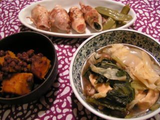 0">とっても地味な献立です(;^_^Aメインは画像奥の、豚バラ肉でたらこを巻いたものと、甘長トマトを巻いてソテーしたもの。豚バラはじっくり焼き付けると脂の甘みが出るので、味付けは塩・こしょうのみで。メイン並みに陣取っているのが、キャベツと小松菜、油揚げ、しめじの煮浸し。圧力鍋の絶品おかずのレシピで、材料は全て、圧力鍋で一緒に煮ています。生の状態で圧力鍋に入れる段階では、あふれんばかりの量でしたが、火を通すとぐーんとかさが減って、野菜がたっぷりとれます♪子供たちには、野菜は炒めるよりも煮たりゆでたりしたほうが、やわらかいし、ほんのり甘くなって、食べやすいようです。煮物は有元葉子さんのレシピで、かぼちゃとあずきのいとこ煮。かぼちゃの煮物はあまり好きではないけれど、あずき(というかあんこ)が大好きな夫と息子対策です。逆に、娘はかぼちゃが大好き&豆類が苦手なので、あずきをよけて食べてましたが・・・(^o^;小豆を煮るひと手間がありますが、甘くてお菓子みたいな煮物で、時々食べたくなる味です