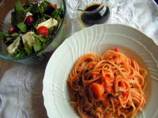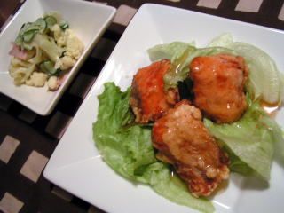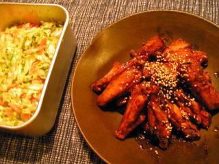 今日は朝からショッピングモールへ出かけ、クリスピー・クリーム・ドーナツに行列してきました。都内ではもう以前ほどの長蛇の列ではないという話を聞いていたので、ほぼ10時ジャストに着いたのに、「最後尾はこちらでーす!」という係員の声を聞いたときにはびっくりその行列に向かってダッシュする人も多くて、なにやら少し殺気だった雰囲気さえ小雨が降る中、結局40分ほど並び、友人と2人で3ダース(!)購入。帰宅後は、子供と一緒にドーナツを2個も食べてしまい、胃がもたれて、夕食の準備にとりかかる意欲はかなり減退気味。そんなところへ夫から「今日は送別会が入った」とメールが。「ラッキー!」(心の声)・・・というわけで、超省略バージョンの夕食です。鶏手羽中は昨日買ってあったので、今日中になんとかせねばということで、てんきち母ちゃんちの毎日ごはん(2)のレシピで、唐揚げに。もう揚げ物はムリ!という感じだったのですが、揚げた後にバルサミコや黒糖を合わせたたれに絡めているので、冷めてもOK明日食べてもいいかな、というつもりで作りました。でも、このこってり甘酸っぱい酢豚のようなたれがなんとも美味♪お腹はあまりすいていなかったけれど、結局ちょこっとつまんでしまいました。サラダはコールスロー。しそを加え、すし酢&マヨネーズで和えて、さっぱりした味に。