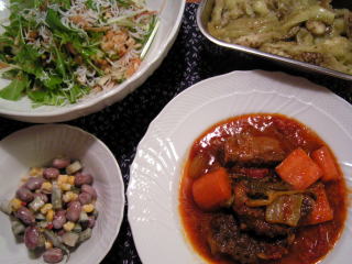 今日は夕方、息子の習い事の付き添いや、実家に立ち寄る用事があったりとバタバタしそうだったので、昼間のうちに夕食を準備しておきました。あやっちのビストロへようこそ!のレシピで、野菜がたっぷり入ったビーフストロガノフです。玉ねぎ以外にも、ピーマンやにんじん、しめじなどが入っていて、ワンプレートでも満足な助かるメニュー。今日は夫の飲みかけのワインがあったので、水分は全量赤ワインですサラダは先日圧力鍋でまとめてゆでておいた大豆、冷凍コーン、きゅうりをカレーパウダーを加えたマヨネーズで和えたもの。煮物などには手軽な水煮もよく利用しますが、こういうシンプルなサラダには、やはり乾燥豆から煮たもののほうが、市販の水煮を使うよりも断然おいしい♪