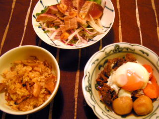 先週半ばの暑いくらいの日に、一気に衣替えをした途端、肌寒い日が続いているので、温かい煮物が食べたくなりました(^o^;Yomeご膳のレシピを参考にしています。牛肉と里芋、にんじんを甘辛く煮て、温泉卵をトッピングするので、食べればなんとなくすき焼きのような味です♪こういう煮物は子供たちも大好きです。ご飯は鶏肉とごぼうの炊き込みご飯。フライパンで焼きつけた鶏もも肉とごぼうがとってもいい香り図書館で借りた圧力鍋の料理レシピのレシピです。サラダは大根、玉ねぎ、しそとたたきにしたかつおを合わせたお刺身サラダ。かつおはお手頃な値段なのに、お刺身食べた~!という気分になれるので、この時期頻繁に登場してます(*^_^*)圧力鍋の料理レシピ