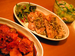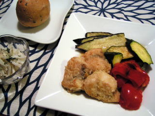 作っておくと、便利なおかずのレシピです。小麦粉をはたいて揚げたかじきをカレー粉入りのマリネ液に浸しています。ズッキーニ、なす、パプリカも素揚げして同じくマリネに。ちょっと我が家には酸味がきつかったので、もっと甘めにしてもよかったかな~。パンは五穀米入りの全粒粉パン。サラダは大根と帆立缶を和えたもの。なんだか今日は暑くて、母子3人でおやつにアイスクリームを食べてしまったので、軽めの夕食でした。作っておくと、便利なおかず