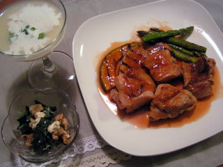 昨日あれこれおかずを作りすぎたので、今日は昨日の残りものを再利用したお手軽な献立に(;^_^A鶏もも肉をグリルパンで焼き、はちみつ&粒マスタードがベースのソースを回しかけて完成。Yomeカフェレシピのメニューです。アスパラもグリルし、昨日のなすマリネも添えて付け合せに。ごぼうはベーコンと一緒にバターで炒めて、シンプルに塩・こしょうで味付け。洋風きんぴらという感じです。お昼にフレンチのフルコースをいただいてしまったので、夜になってもまったく食欲がわかず、ちょっと品数少なめの夕食です(^o^;夫も飲み会だったので、ま、いいか・・・。* * * * * * * * * * * * * * * *今日は大学時代の友人たちとコレド日本橋でランチ。出会ってからちょうど20年(!)が経ち、それぞれ母親業もひと段落つき、子供抜きで会えることになったので、レカン系列のフレンチのお店に。中には海外に行っていて、10年近く会っていなかった友人もいたのですが、外見も中身も全然変わっていなくて、とっても和めました♪しっかり者の友人が多いので、やっぱりみんな子育ても一本スジが通っていて、周囲に流されやすい私は、その点ちょっと反省したり・・・(;^_^A偶然にも、明日は全員子供の運動会で、今日は下校が早いということで、早々のお開きとなりましたが、とても充実した時間で、リフレッシュできました。