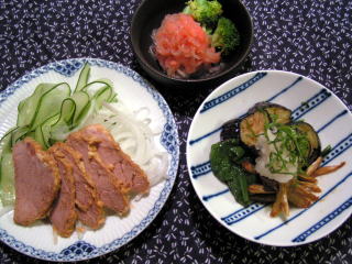 先日、実家の母からのお土産でもらったこんにゃくの味噌漬け。捨てるには惜しいくらいお味噌がたっぷりついていました。パッケージに再利用できますと書いてあったので、ゆで豚を漬け込んでみました。ゆで豚は、豚肩ロース肉のかたまりを長ネギの青い部分や生姜と一緒に圧力鍋でゆでたもの。温かいうちに味噌床へ。半日ほどおいておくと、なんともいい香りの味噌味のゆで豚になりました。新玉ねぎときゅうりのスライスをたっぷり添えてさっぱりと。メインがあっさりめだったので、野菜料理は揚げ物です。なす、ピーマン、ごぼうを素揚げにしてめんつゆに漬け込んでいます。我が家の夏の定番野菜料理です。小鉢はしらたきのたらこ和え。Yomeご膳のレシピです。つきだし風の一品ですが、これが意外にも子供たちに大受け偏食娘もおかわりして食べてました