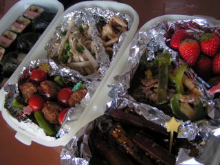 今日は朝からお弁当を持ってアンデルセン公園へ。ここはお花見のシーズンもきれいだし、子供向けのイベントも充実しているのだけど、今回の目的は子供たちの大好きなアスレチック比較的新しいせいか、他のアスレチックでは見たことがないような、珍しいタイプのものがたくさんあって、遊び甲斐がありました!まるでオブジェのような凝った作りの遊具も。すり鉢状の木の上をひたすら走る!というモノ。単純なようですが、これが子供にはすっごく楽しかったようです。息子は全力疾走、娘はロープに沿って何周も・・・(;^_^Aこの後、娘は勢い余って、夫とともに見事に池ポチャでしたこういう不安定なゆらゆらする遊具が大好きな娘。心配する夫の手を振り切って遊んでます・・・(^o^;朝、大急ぎで作ったお弁当おにぎり(鮭、たらこ、おかか、ゆかり)に、卵焼き、唐揚げ・・・という定番のラインナップです卵焼きはゆでたほうれん草をおしょうゆで和えたものと、たらこを巻いてあります。煮物はかぼちゃと小豆のいとこ煮。パンに入れるためにゆでて使い残した小豆とゆであずきの缶詰を利用しました。唐揚げは衣にオイスターソースを加えて、しっかりめの味付けに。唐揚げのお供の定番、フライドポテトとコールスローも。