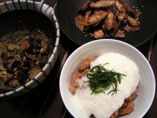 旅行の後は、お手軽な丼モノの献立です。片栗粉をはたいて焼き付けた豚肉に、甘辛味のたれをまわしかけ、押し麦を加えて炊いたご飯にのせ、さらに大和芋のとろろを。Yomeご膳のレシピを参考にした、連休疲れを癒す(?)疲労回復メニューです(;^_^Aおつまみ感覚でカリカリ食べられるごぼうはてんきち母ちゃんちの毎日ごはん(2)のレシピ。片栗粉をつけて揚げたごぼうを甘辛味のたれで和えてあります。カリカリのごぼうに甘辛いたれが後を引く味!ごぼうはたっぷり2本分揚げてもその日のうちになくなります~(*^_^*)片口すり鉢の中は、なすのナムル。なすはフライパンでじっくり炒め、すりごまやにんにく、おしょうゆ、すし酢などで調味し、炒った松の実をパラパラ。この片口すり鉢はごまをすった後、そのまま素材を和えることができる大きさと、食卓に出しても違和感のないデザインがお気に入り。合羽橋の田窯で見つけて、ちょっとかさばるし、重かったけれど、頑張って持ち帰った甲斐あって、活躍してくれてます