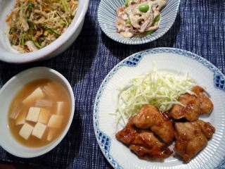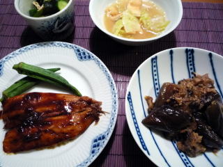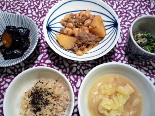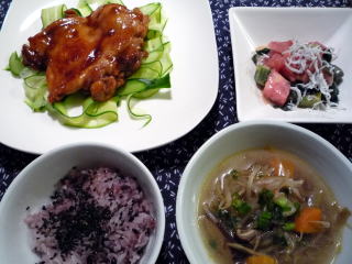 いつもの鶏もも肉の照り焼きだれに酢とオイスターソースを加えたもの。コクがアップして、ごはんが進みます。このたれが気に入ったせいか、いつもはきゅうりを食べない偏食娘が、たれの絡んだ付け合せのきゅうりをパクパクピーラーで薄く削ったのも食べやすかった模様(*^_^*)あとは、オクラ、トマト、わかめ、しらすのごま酢和えに、ごぼう、椎茸、大根、にんじんなど野菜たっぷりの汁物。ごはんは黒米を加えて炊いたもの。子供たちはこれに黒ゴマと天然塩を振って食べるのが大好き。