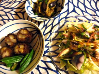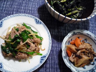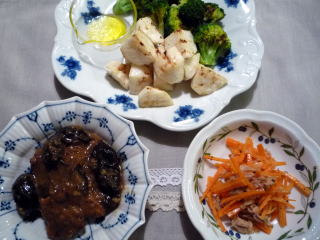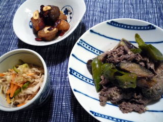 週末はたいていカロリー過多になるせいか、休み明けの月曜日はあっさりした和食が食べたくなります(*^_^*)今日はなすとピーマン&牛こまの煮物に、大根とこんにゃく、ベーコンの炒め物、そして昨日の切り干し大根のサラダという地味~なラインナップ。3品ともてんきち母ちゃんちの毎日ごはん(2)のレシピです。煮物はすぐにできるのですが、意外に手間がかかるのがこんにゃくと大根のソテー。こんにゃくは下ゆでしてから表面に浅く細かく切り込みを入れ、大根はお米を入れた水で下ゆでしてあります。にんにくは最初に炒めて油に香りを移したら、ペーパータオルで油を切って待機させ、仕上げにパラパラと散らします。ちまちまとした作業が多いのですが、子供たちが大好きなので、何度もリピートしているおかずです。息子はこんにゃく、娘は焼き大根多めに盛り付けるのがお約束♪