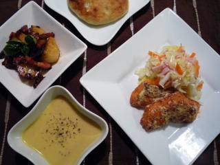 生鮭に塩・こしょうをしてからグリルパンで焼き、大根おろしとゆずポン酢でさっぱりといただきました。付け合せにアスパラガスもグリルしてのせました。副菜はてんきち母ちゃんレシピで、もやしとにらのマヨネーズ炒め。仕上げにはかつおぶしをからめてあります。マヨネーズ&かつおぶしのおかげで、野菜だけでも味が寂しくなることもなく、もやしがとってもおいしくいただけました。卵を入れてもよさそうです。そしてかぼちゃもてんきち母ちゃんちの毎日ごはん(2)のレシピで、カレーバター煮にしました。簡単でシンプルな味付けなのに、我が家で大人気の味で、何度もリピートしています。ちょっと水っぽいかぼちゃでもなんとかなります(;^_^A汁物はさつまいも、玉ねぎ、にんじんの白味噌仕立て。最後に牛乳を加えているので、色は真っ白ですが、味は味噌汁です。たかこ@caramel milk teaさんのおもてなしランチ会のらくちんメニューブックのレシピです。ほんのり甘くて、たまには白味噌仕立てもいいな~と思える一品です。