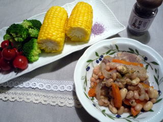 沖縄に出かける前に仕込んでおいた塩豚がいい感じになってきたので、今日はそれを使って洋風の煮込みモノ。にんにくと玉ねぎを炒め、大きめに切った塩豚、にんじん、缶詰の白いんげん豆、ゆでて冷凍しておいた大豆、を加えてルク鍋でコトコト。塩豚からいいダシが出るので、味付けは顆粒コンソメと塩・こしょう、イタリアンハーブMIXのみ。さっぱりといただけます♪あとはゆでたとうもろこし、ブロッコリにプチトマト。今日は大量の洗濯と海グッズの後始末で半日つぶれてしまったので(←言い訳です)かなり手抜きの夕食です(;^_^Aお塩は沖縄で買った紅芋塩を添えてみました。ほんのりピンクで、紅芋の香り。天ぷらに添えてもよさそうです