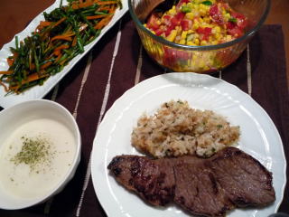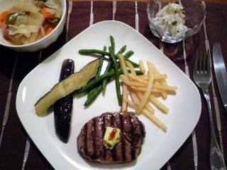 男2人のキャンプ中、ロクなものを食べてなかったというので、ちょっと奮発してステーキにしました。私はヒレ肉ですが、夫と息子はボリュームたっぷりのサーロイン。ソースは前日からカットしたにんにくをお醤油に漬け込んだにんにく醤油とバター。スープは野菜たっぷりのミネストローネ。サラダは大根&帆立水煮缶をマヨネーズで和えた我が家の定番、大根サラダ。沖縄に比べると外房の海は波が荒くて、シュノーケリングは無理だったけれど、ボディーボードには最高だったそうです。いよいよ明日から学校だーーー\(^O^)/